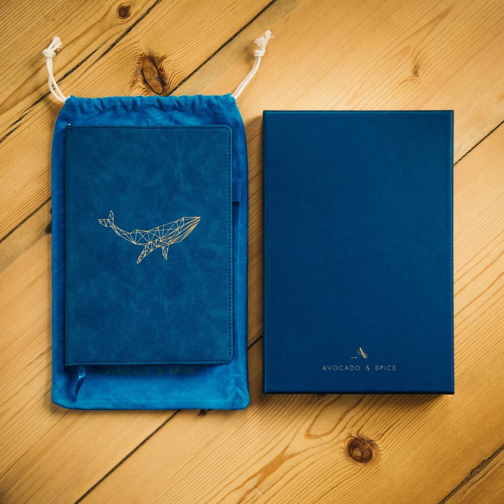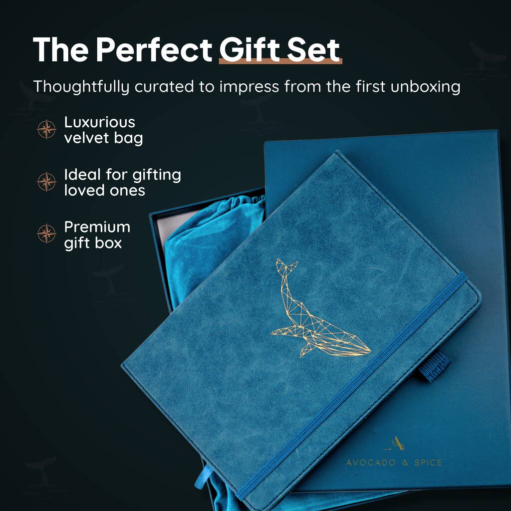 The A5 Blue Whale Notebook from Avocado & Spice combines style, practicality, and thoughtful design. With a buttery-soft PU leather cover and gold foil whale emblem, it feels as good as it looks. Inside are 200 thick 120gsm cream pages, available in lined, dotted, squared, or plain, perfect for writing, planning, or sketching. Thoughtful details include a ribbon bookmark, elastic strap, and built-in pen holder to keep everything organised. Beautifully packaged, this notebook makes a meaningful gift for writers, students, professionals, or anyone who loves stationery.