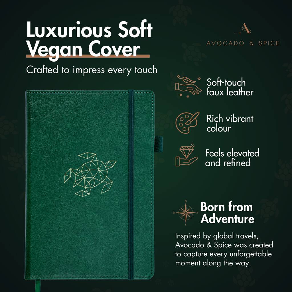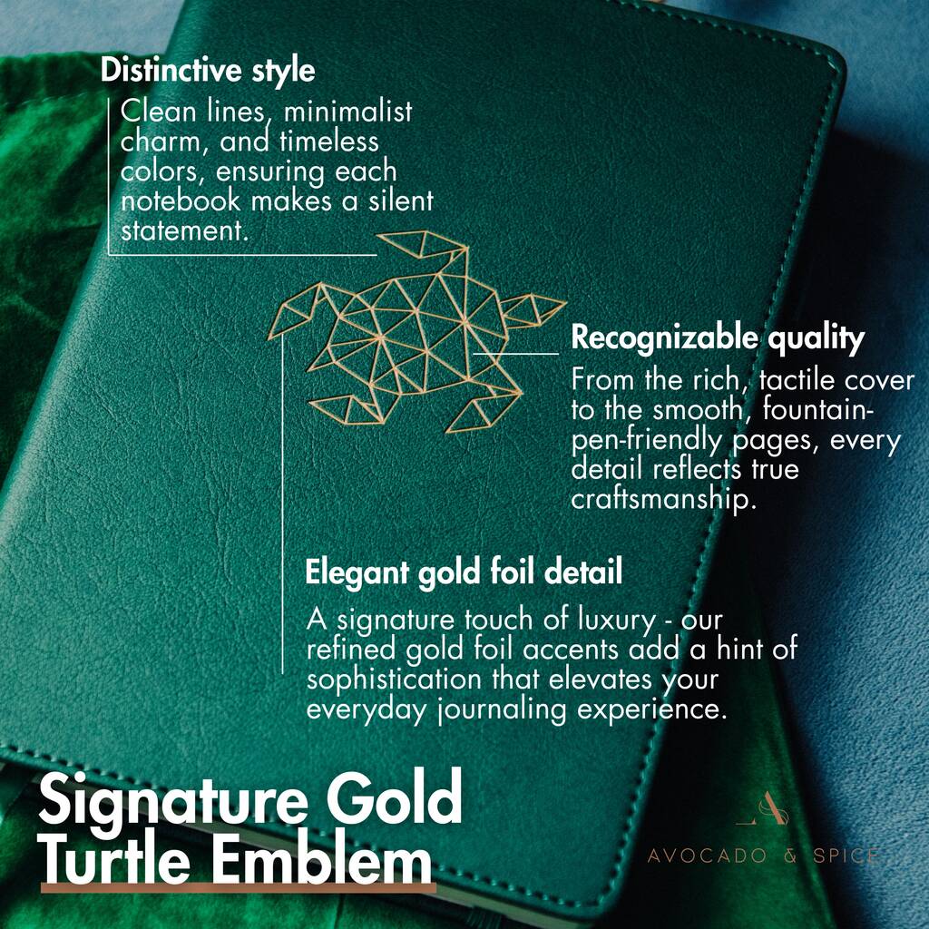The A5 Green Turtle Notebook from Avocado & Spice combines style, practicality, and thoughtful design. With a buttery-soft PU leather cover and gold foil turtle emblem, it feels as good as it looks. Inside are 200 thick 120gsm cream pages, available in lined, dotted, squared, or plain, perfect for writing, planning, or sketching. Thoughtful details include a ribbon bookmark, elastic strap, and built-in pen holder to keep everything organised. Beautifully packaged, this notebook makes a meaningful gift for writers, students, professionals, or anyone who loves stationery.