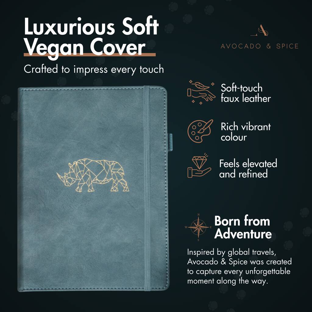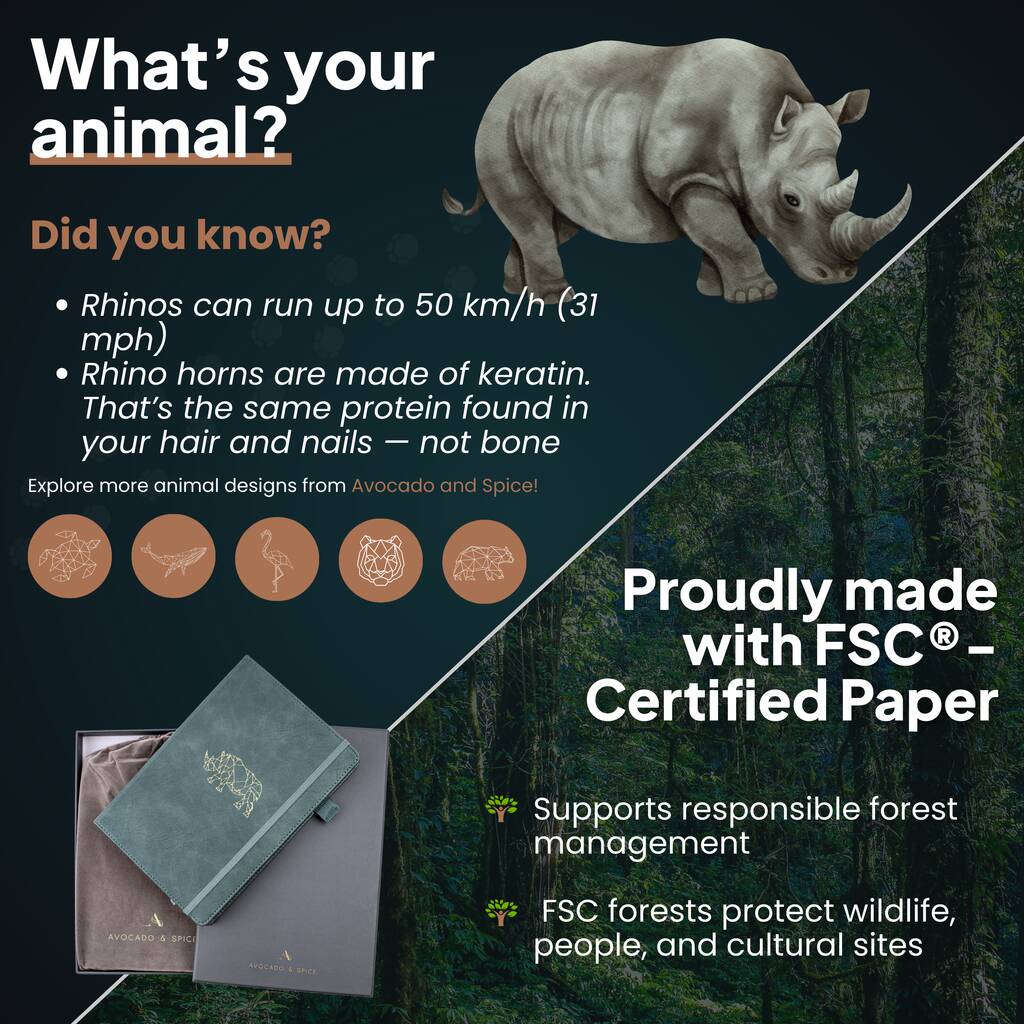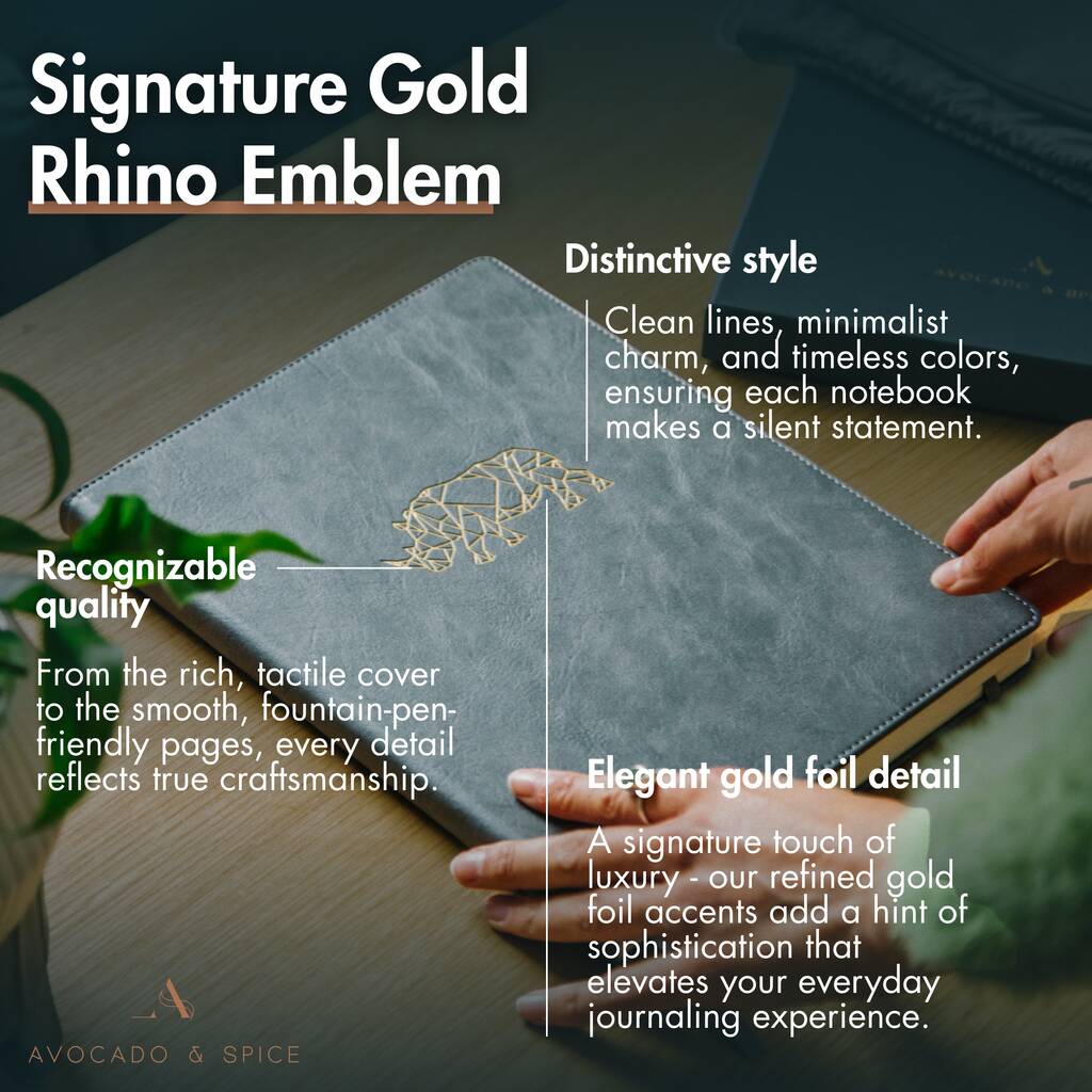 The A4 Grey Rhino Notebook from Avocado & Spice is designed for those who want more room to think, plan, and create. Bound in a buttery-soft PU leather cover and finished with a gold foil rhino emblem, it combines elegance with practicality.