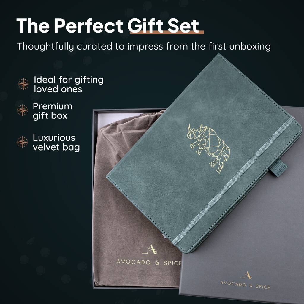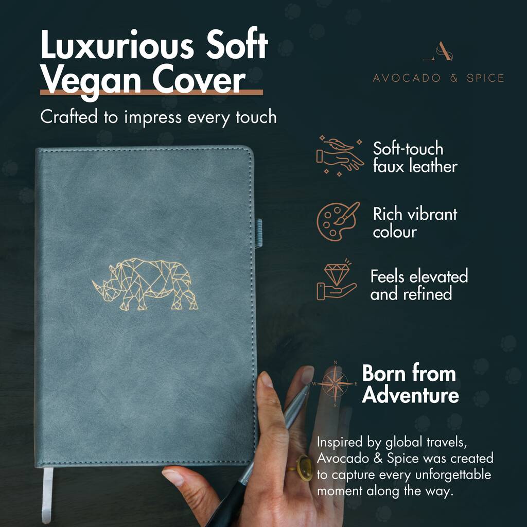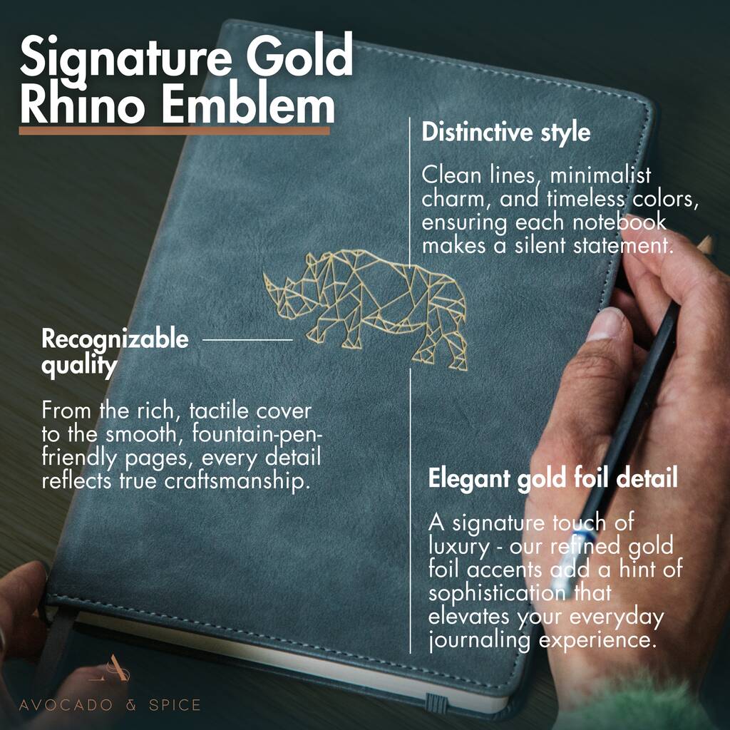 The A5 Grey Rhino Notebook from Avocado & Spice combines style, practicality, and thoughtful design. With a buttery-soft PU leather cover and gold foil rhino emblem, it feels as good as it looks. Inside are 200 thick 120gsm cream pages, available in lined, dotted, squared, or plain, perfect for writing, planning, or sketching. Thoughtful details include a ribbon bookmark, elastic strap, and built-in pen holder to keep everything organised. Beautifully packaged, this notebook makes a meaningful gift for writers, students, professionals, or anyone who loves stationery.