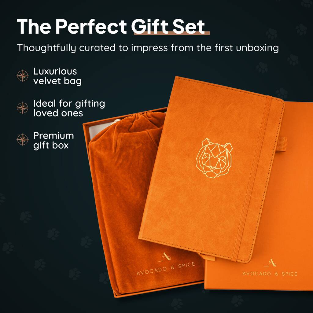 The A5 Orange Tiger Notebook from Avocado & Spice combines style, practicality, and thoughtful design. With a buttery-soft PU leather cover and gold foil tiger emblem, it feels as good as it looks. Inside are 200 thick 120gsm cream pages, available in lined, dotted, squared, or plain, perfect for writing, planning, or sketching. Thoughtful details include a ribbon bookmark, elastic strap, and built-in pen holder to keep everything organised. Beautifully packaged, this notebook makes a meaningful gift for writers, students, professionals, or anyone who loves stationery.