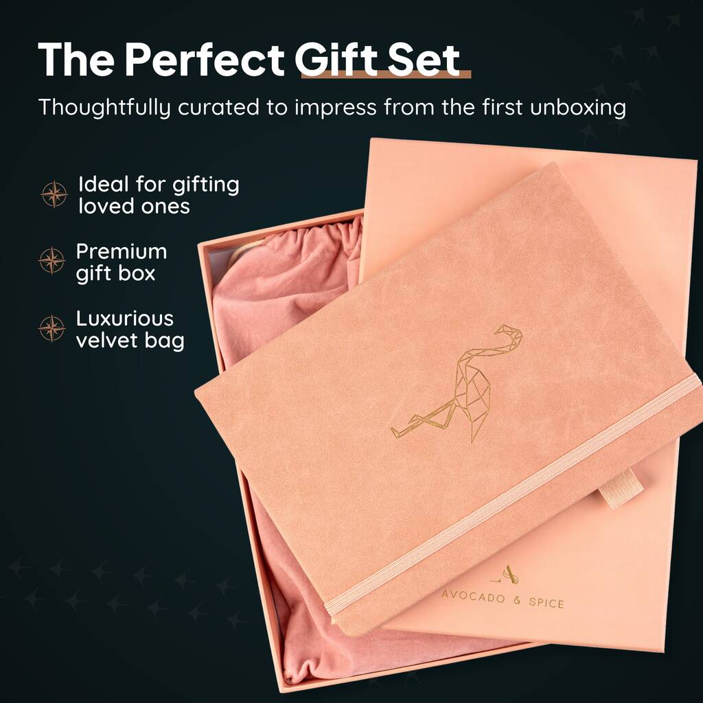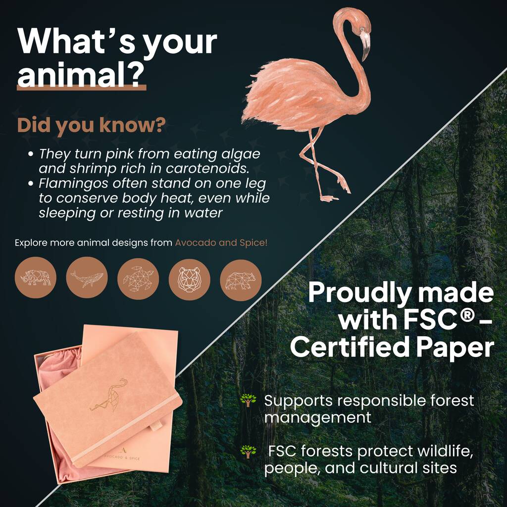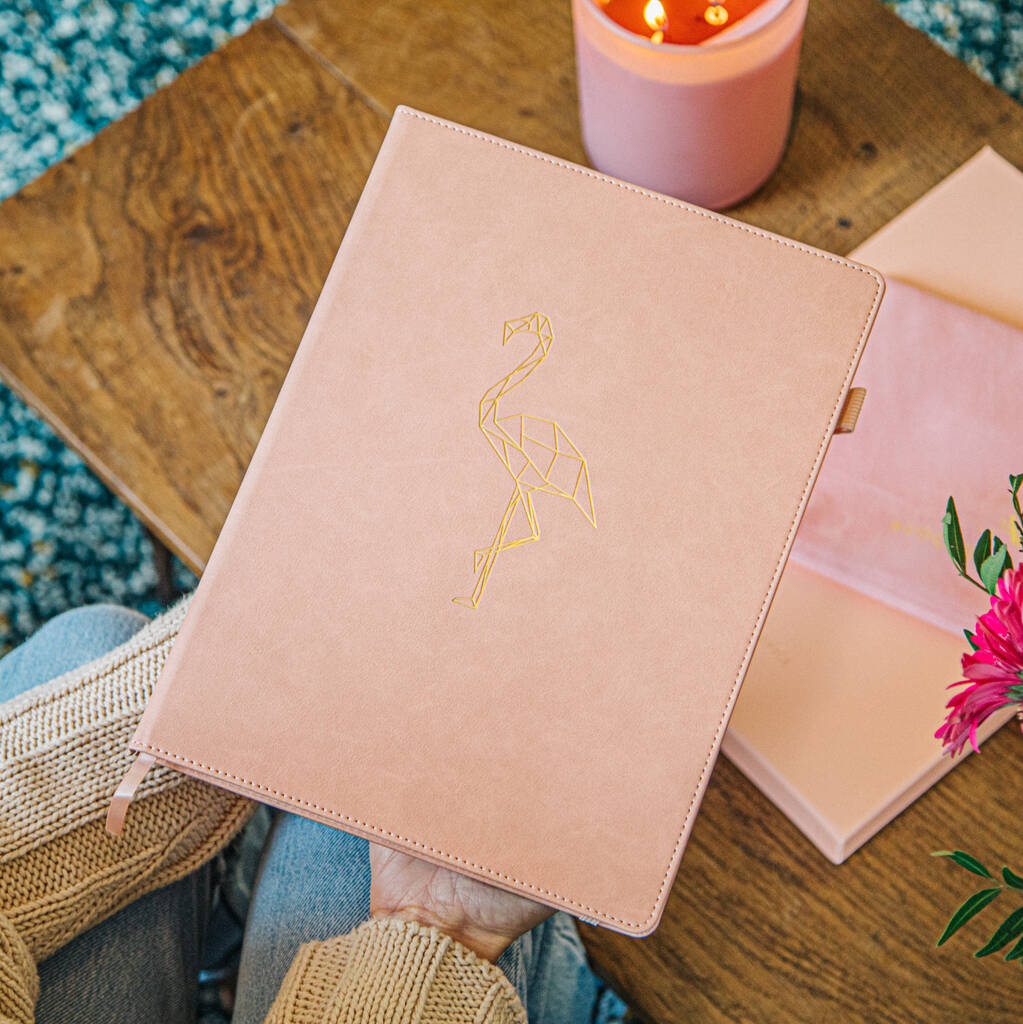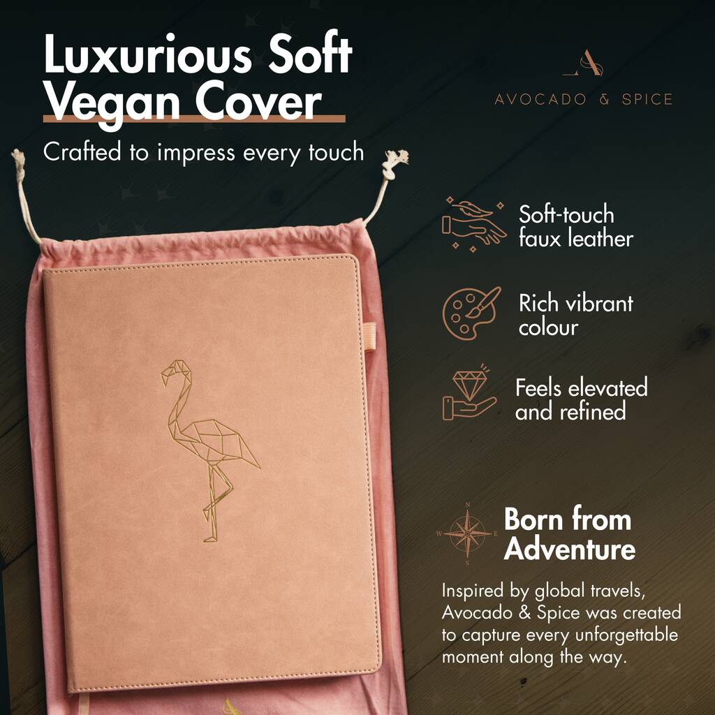 The A4 Pink Flamingo Notebook from Avocado & Spice is designed for those who want more room to think, plan, and create. Bound in a buttery-soft PU leather cover and finished with a gold foil flamingo emblem, it combines elegance with practicality.