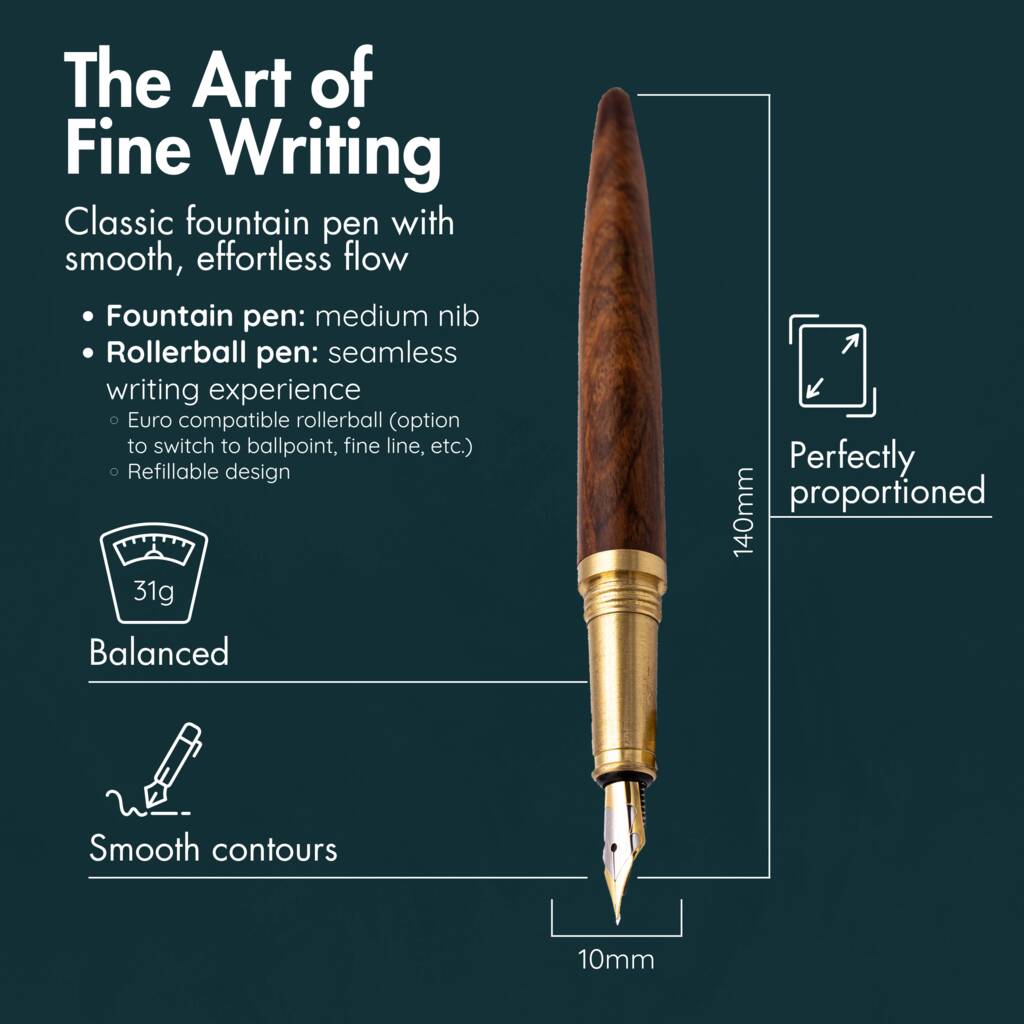 The fountain pen is compatible with international ink cartridges and comes with a converter for bottled ink, while the rollerball uses standard refills. Presented in a rosewood gift box, this set makes a meaningful gift for writers, professionals, and anyone who appreciates fine stationery.