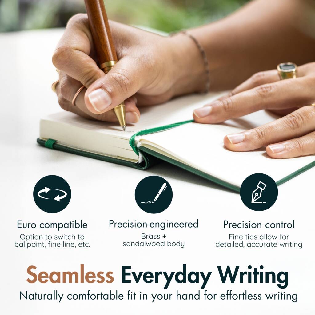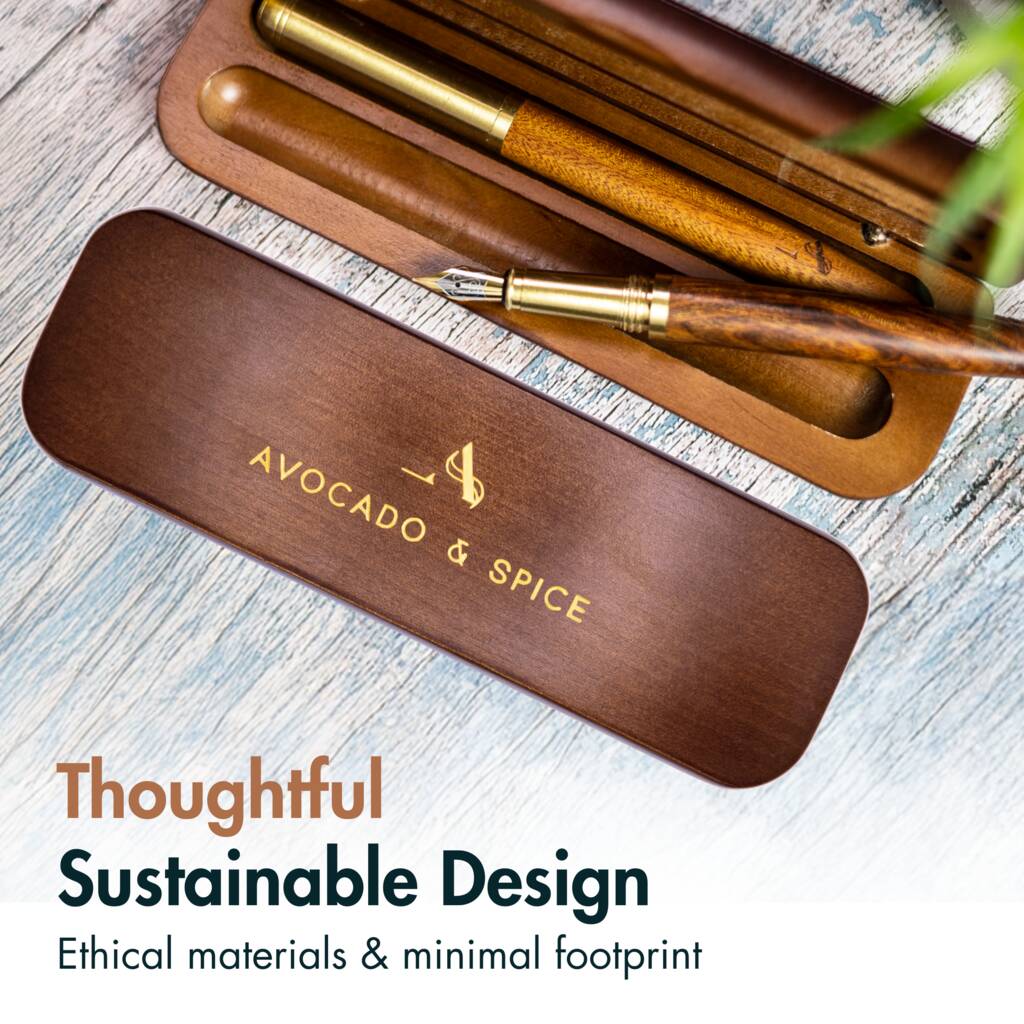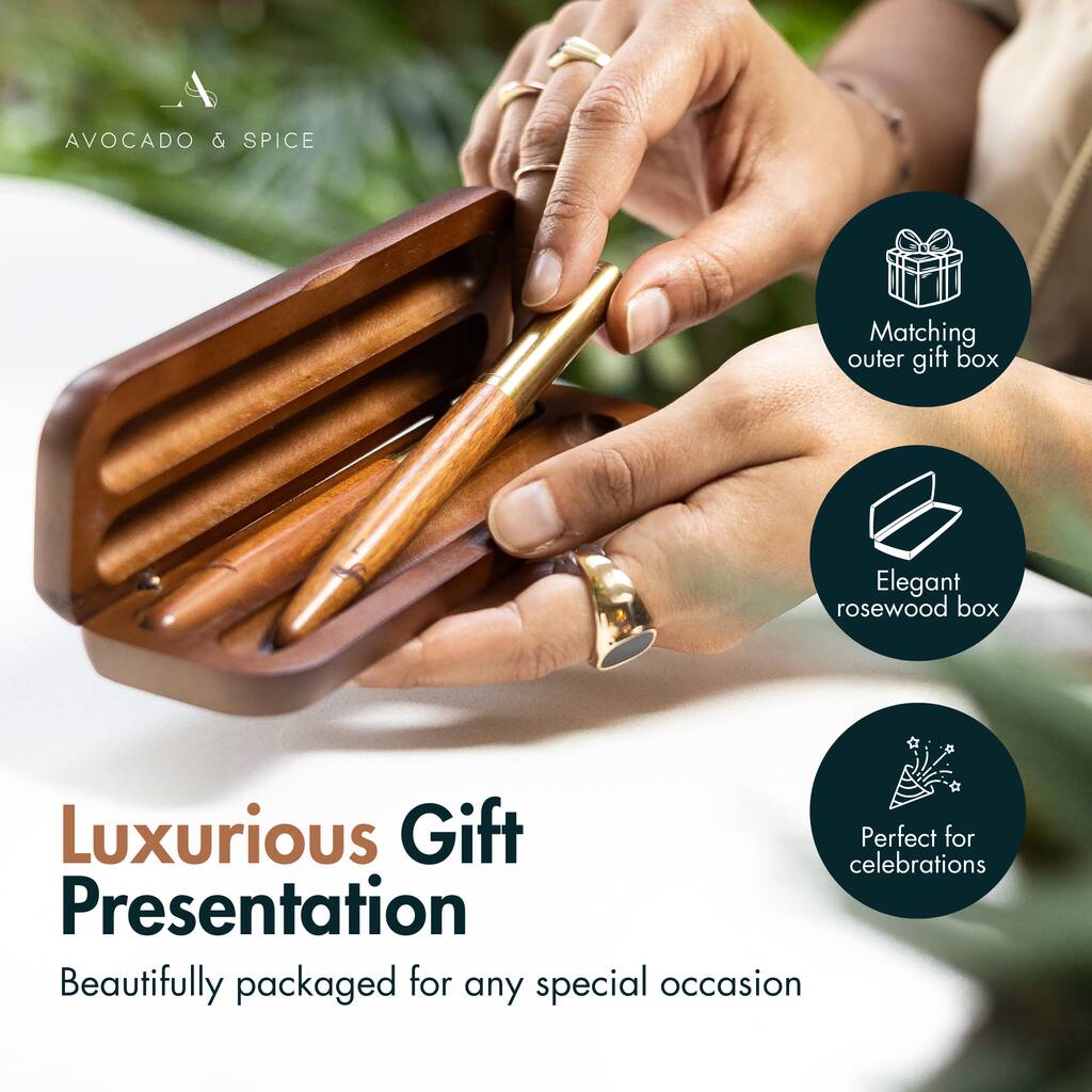 A handcrafted writing set featuring a fountain pen and rollerball in polished Sandalwood. Elegant, practical, and beautifully presented for gifting.The Avocado & Spice Sandalwood Pen Set combines timeless craftsmanship with everyday practicality. Each set includes a fountain pen with a medium stainless steel nib and a rollerball pen for smooth, effortless writing. Both are crafted from polished Sandalwood with brass details for a warm, elegant finish.