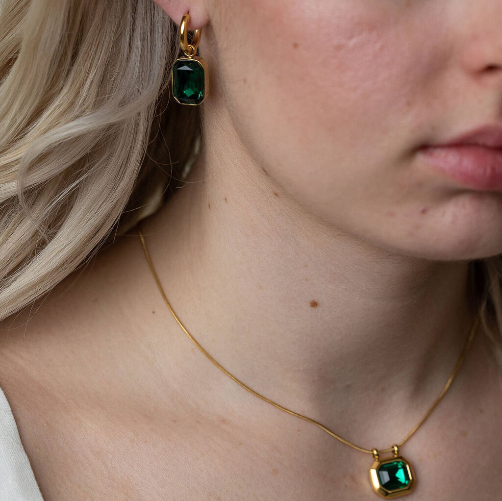 Emerald necklace and earring set in gold. Tarnish-free hypoallergenic jewellery set. Comes with free personalised pouch.