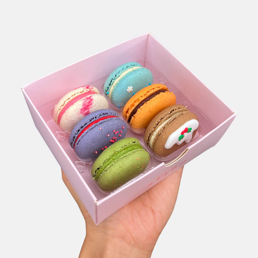 ALL MACARON SHELLS: caster sugar, ground almonds, icing sugar (icing sugar; anti-caking agent: E341), egg white, butter (milk), double cream (milk), cream of tartar (raising agent: monopotassium tartrate).