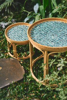 Each table is carefully handcrafted using sustainable rattan and natural materials to reflect the silvery, turquoise hues of the sea. Designed with both beauty and practicality in mind, this versatile set can be styled as elegant coastal coffee tables, quirky bamboo bedside tables, or handy accent tables for any space.