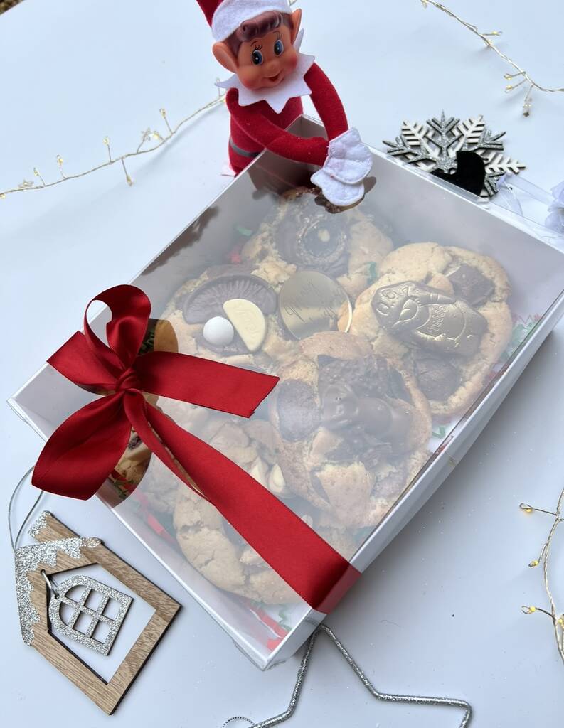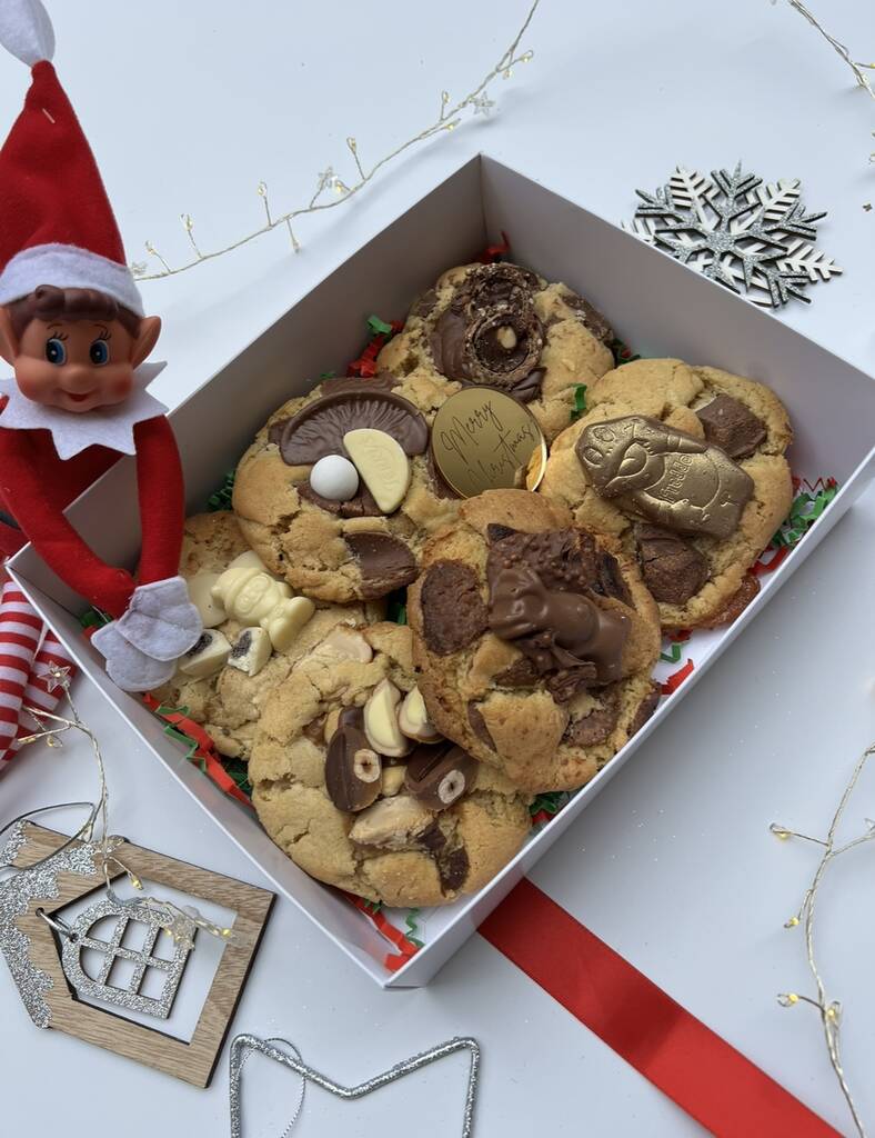 4 or 6 of our incredible cookies, loaded and topped with the Christmassy chocolates you choose. You can have all different flavours. Let us know your chosen flavours or we will do what is pictured/popular.