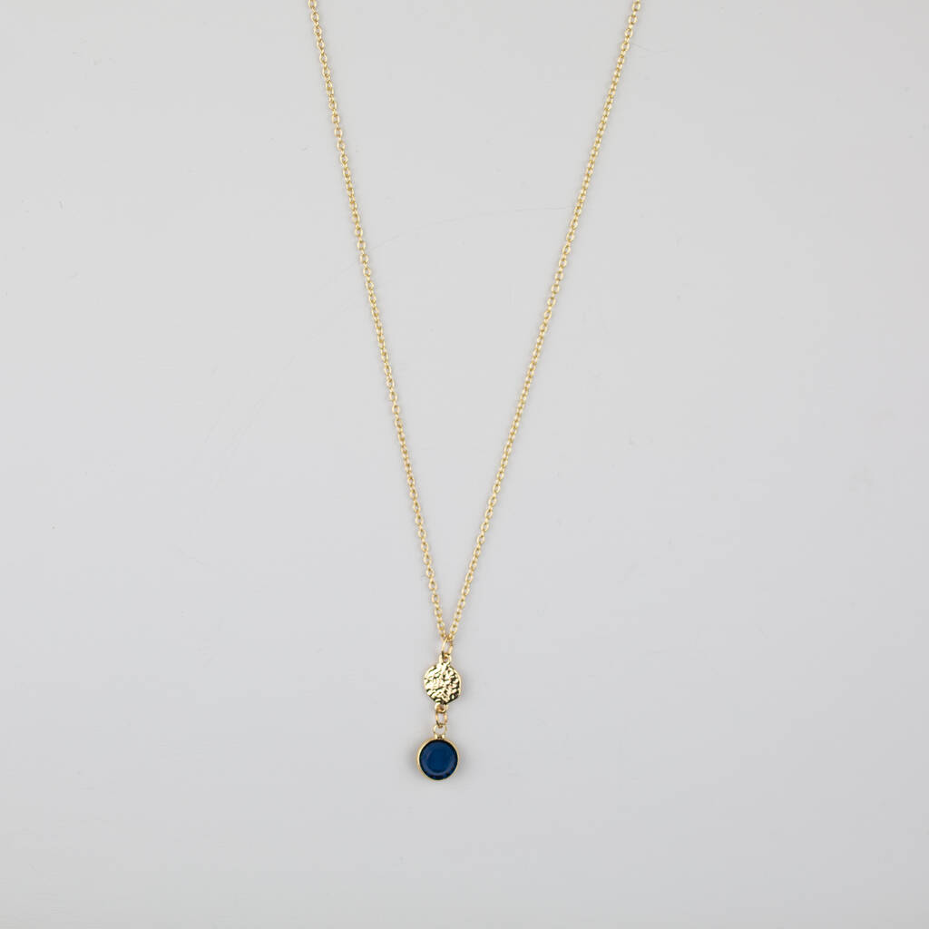 Suspended from a fine gold plated chain, a beautifully detailed hammered disc catches the light with its intricate texture. Beneath it hangs a deep sapphire-blue gemstone charm, adding a rich pop of colour and a refined finish. The combination of warm gold and vivid blue creates a piece that feels both classic and contemporary.