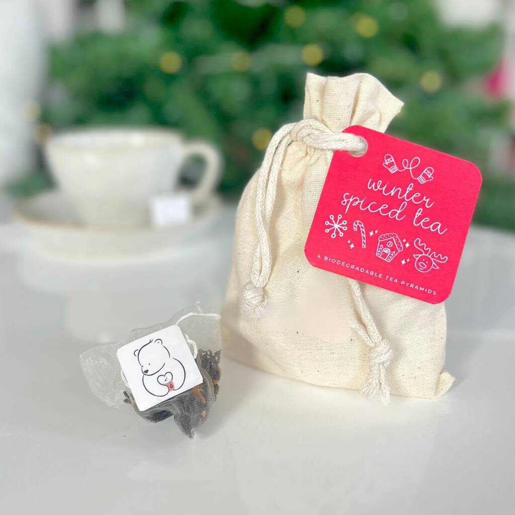 Winter Spiced Tea: Black tea, Cinnamon, Cloves, Jasmine Petals, Natural flavours.