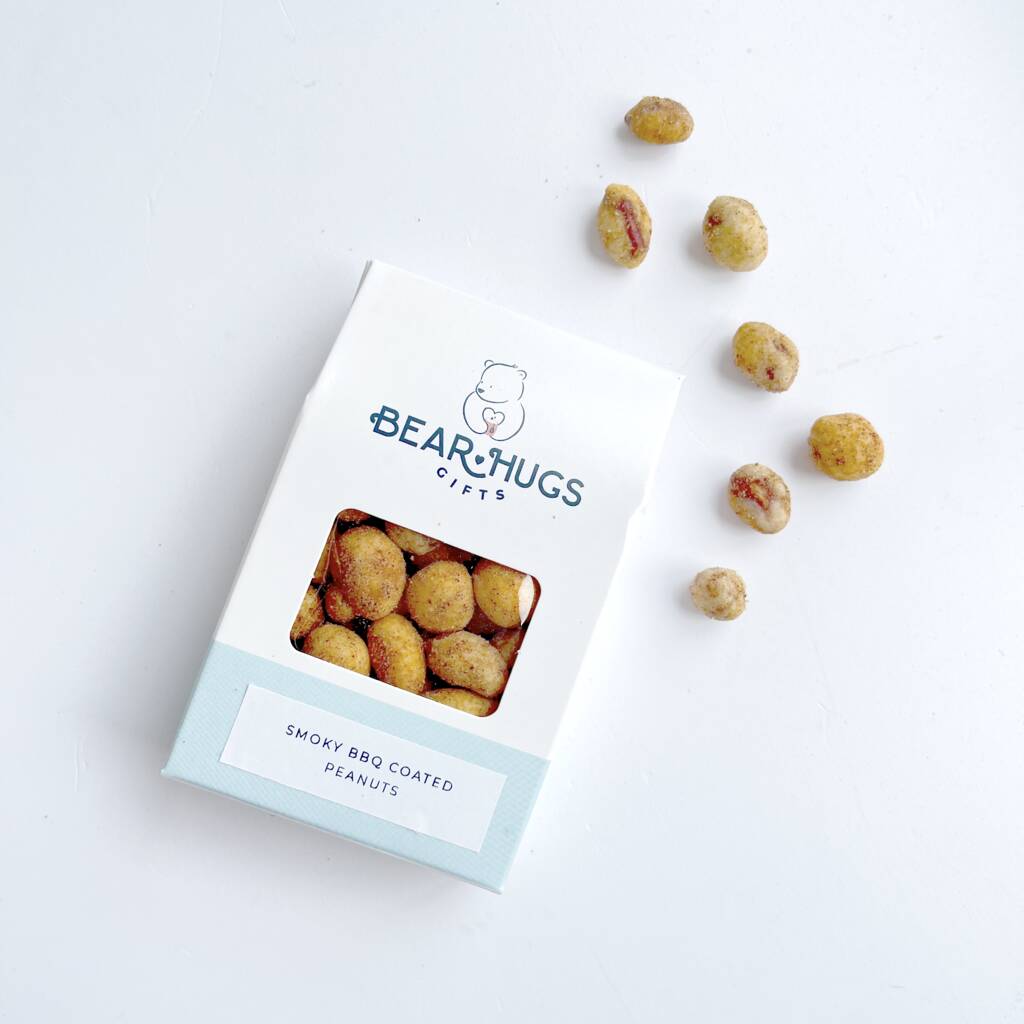 Smoky BBQ Peanuts: PEANUTS 42%, potato starch, rapeseed oil, modified potato starch, sugar, WHEAT flour (WHEATflour, calcium carbonate, iron, niacin, thiamin), seasoning 3% (salt, dextrose, rice flour, dried yeast, sugar, yeast extract powder, spice [smoked paprika, black pepper], onion powder, garlic powder, smoke flavouring, flavouring, acid: citric acid), salt.