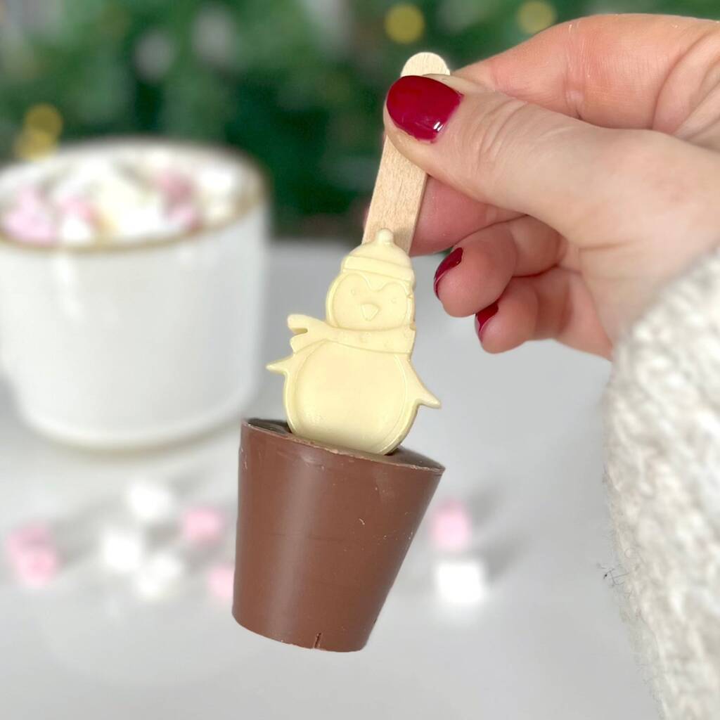 Penguin Hot Chocolate Stirrer: Milk and White chocolate (min 33.6% and 29%), sugar, whole MILKpowder, cocoa mass, cocoa butter, emulsifiers (SOYA lecithin, E322), natural vanilla, edible glitter.
