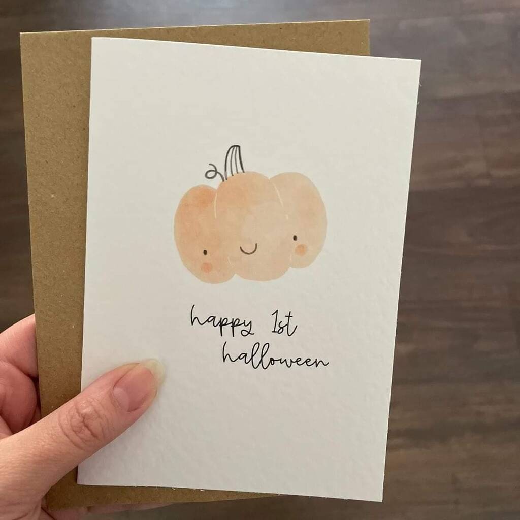- Happy 1st Halloween card. Made by a gorgeous small business for us. Printed on 300gsm lightly textured card, complete with a brown Kraft envelope. A message can be handwritten in here for you (if you would like to send direct).