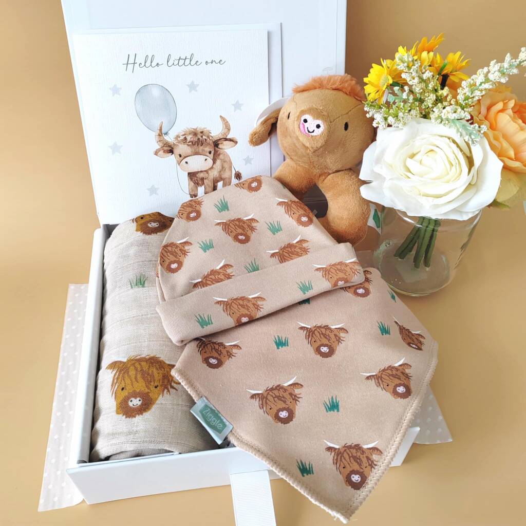 Our Highland Cow Baby Gift Set is the perfect unisex gift to send to a new mum and baby, or a mum to be for their baby shower or maternity leave.