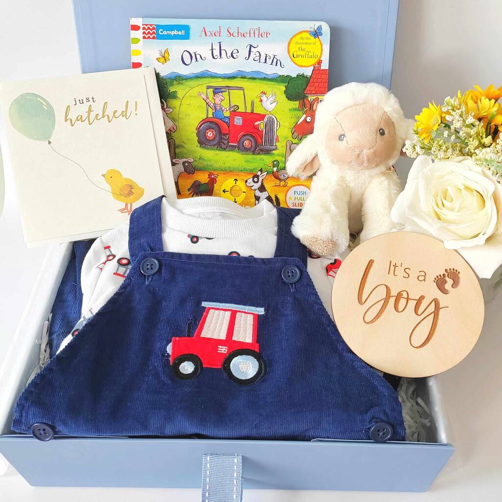 This Farmyard Baby Boy Gift Box is the perfect present for newborn baby boys. Featuring an adorable tractor dungarees outfit, a farmyard-themed baby book, and a soft lamb rattle, presented in a luxury gift box.