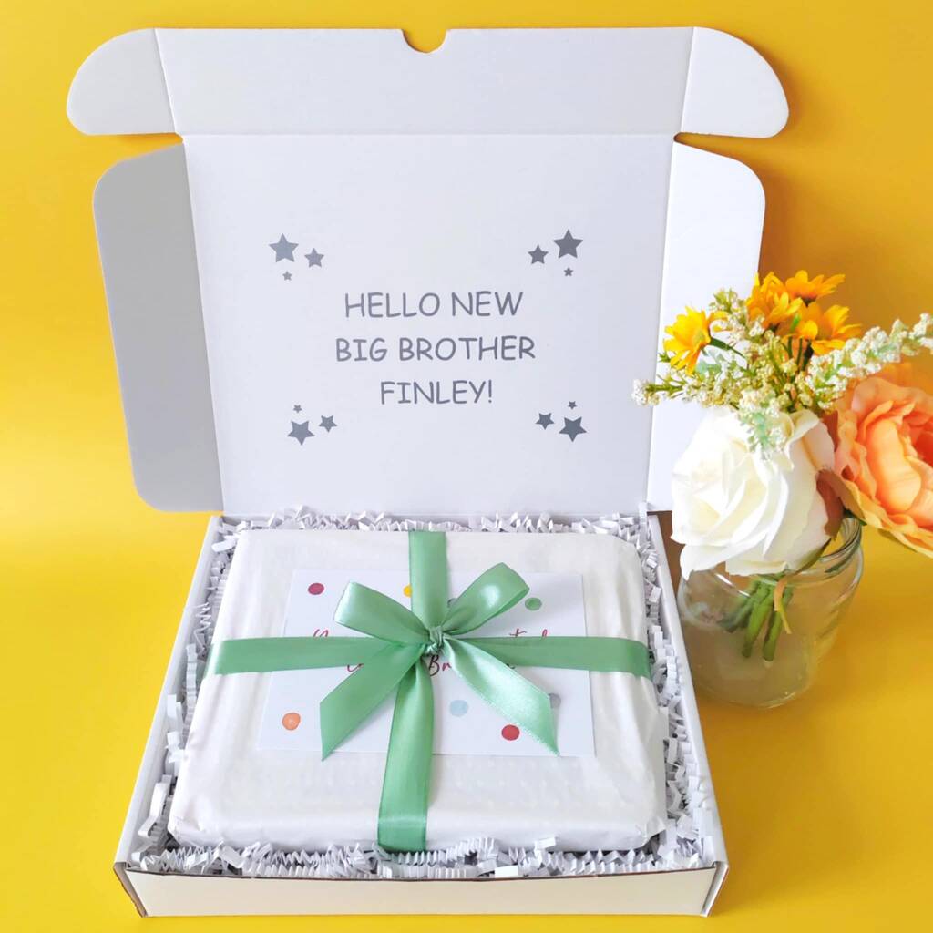 This gift arrives in a white, blue or bunny patterned postal box which has a personalised silver vinyl sticker with the big brother's name on. Inside the items are wrapped in white polka dot tissue with a blue ribbon.