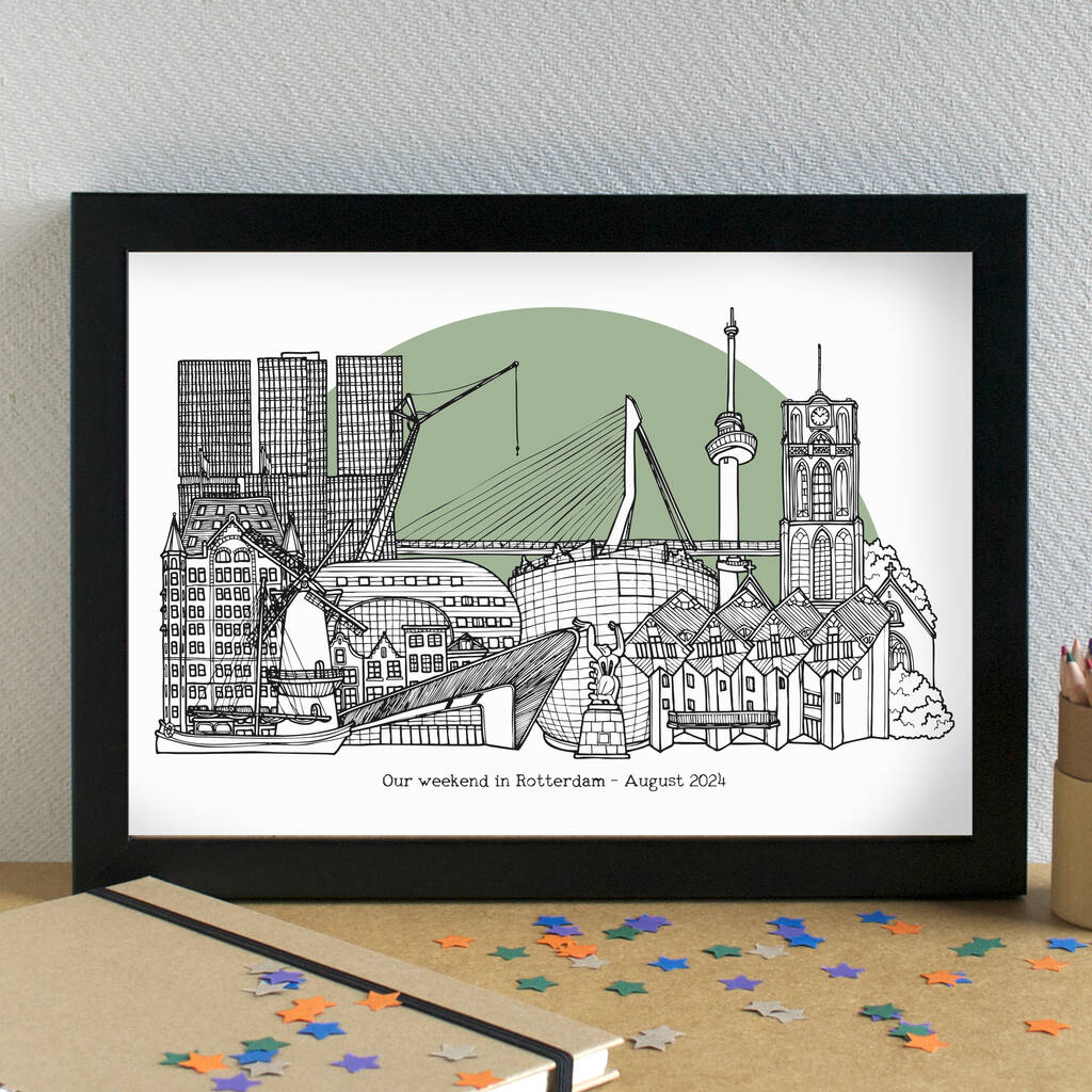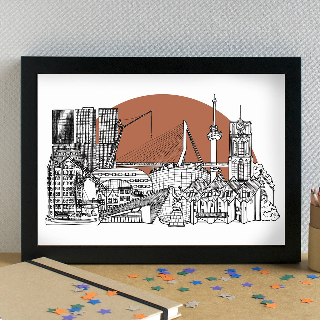 A pretty print of my skyline illustration of the most famous contemporary and classic landmarks in Rotterdam, Netherlands.