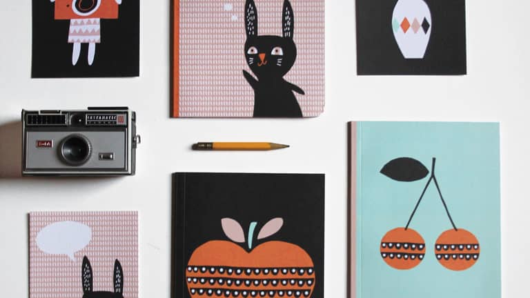 Inspiration has been taken from childhood books, travels, fabrics and packaging. All the designs are hand-drawn by the designer and have been used to decorate her cushions, cards, ceramics and notebooks.