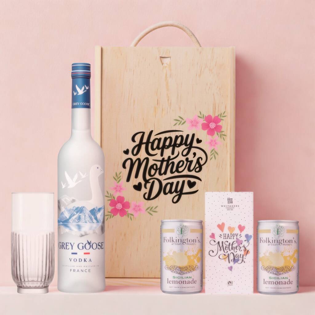 Treat her to this premium Mother’s Day vodka gift set, featuring Grey Goose Vodka (70cl), two Folkington’s Sicilian Lemonade cans and a Whitakers Mother’s Day chocolate bar.