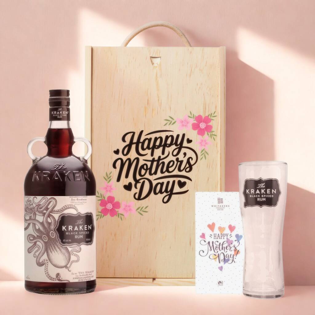 This Mother's Day Kraken Black Spiced Rum Gift Set features a bottle of Kraken Spiced Rum in a keepsake wooden themed gift box.