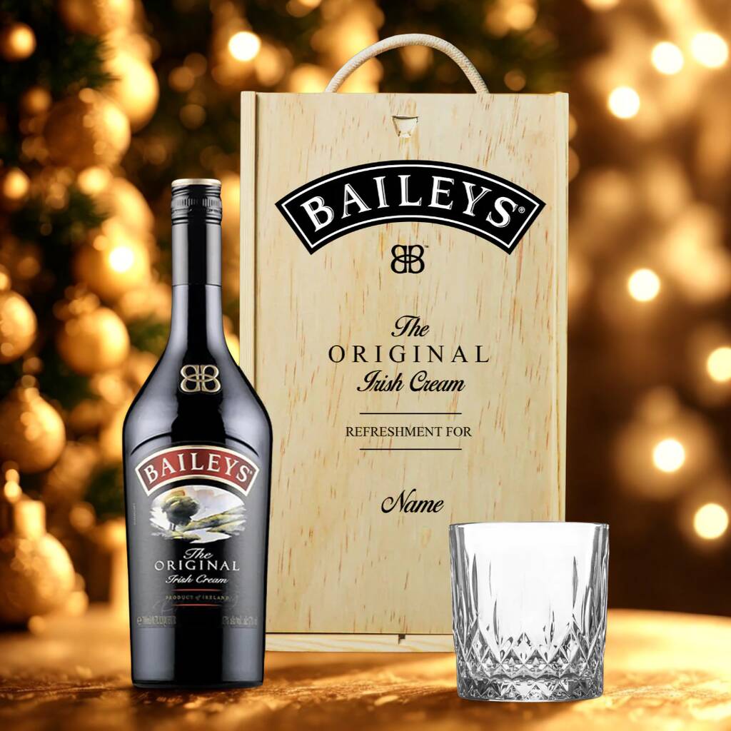 Elegantly presented in a wooden box. This Personalised Baileys Original Irish Cream Liqueur Gift Set With Glasse can be personalised with the recipients name.
