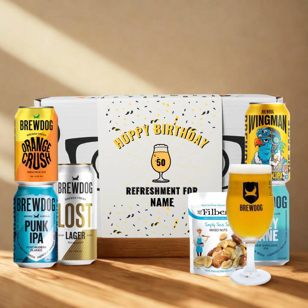 Personalised Brewdog Happy Birthday Craft Beer Gift Set With Glass And Snack Five Can