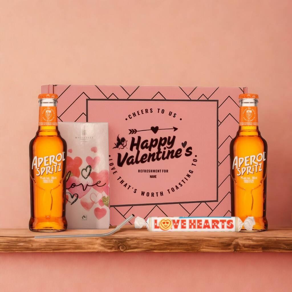 This vibrant Aperol gift set for couples includes refreshing ready-to-drink Aperol Spritz, indulgent chocolate, nostalgic love heart sweets, and a stylish reusable metal straw. It’s a unique gift idea that feels fun, thoughtful, and perfectly suited to relaxed evenings or celebratory toasts together.