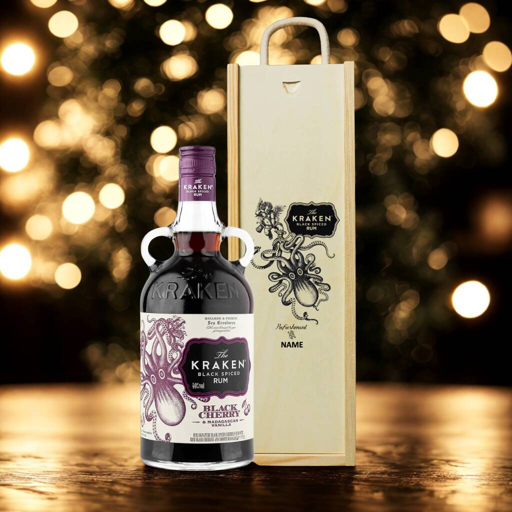 This Personalised Kraken Black Cherry Rum Gift Set features a bottle of Kraken Black Cherry & Vinilla in a decorative, personalised wooden gift box.