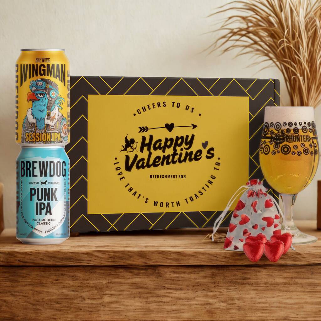 This Valentine's Day, give the gift of delicious craft beer with our Personalised Brewdog Craft Beer Can Gift Set. Featuring two of our Beerhunters favourites - the bold and tropical Punk IPA and the zesty and refreshing Wingman - this set is the ultimate treat for beer lovers. Plus, it comes with a branded glass and heart-shaped chocolates for an extra touch of romance. Add a heartfelt gift message for your special someone. Cheers to love and great beer!