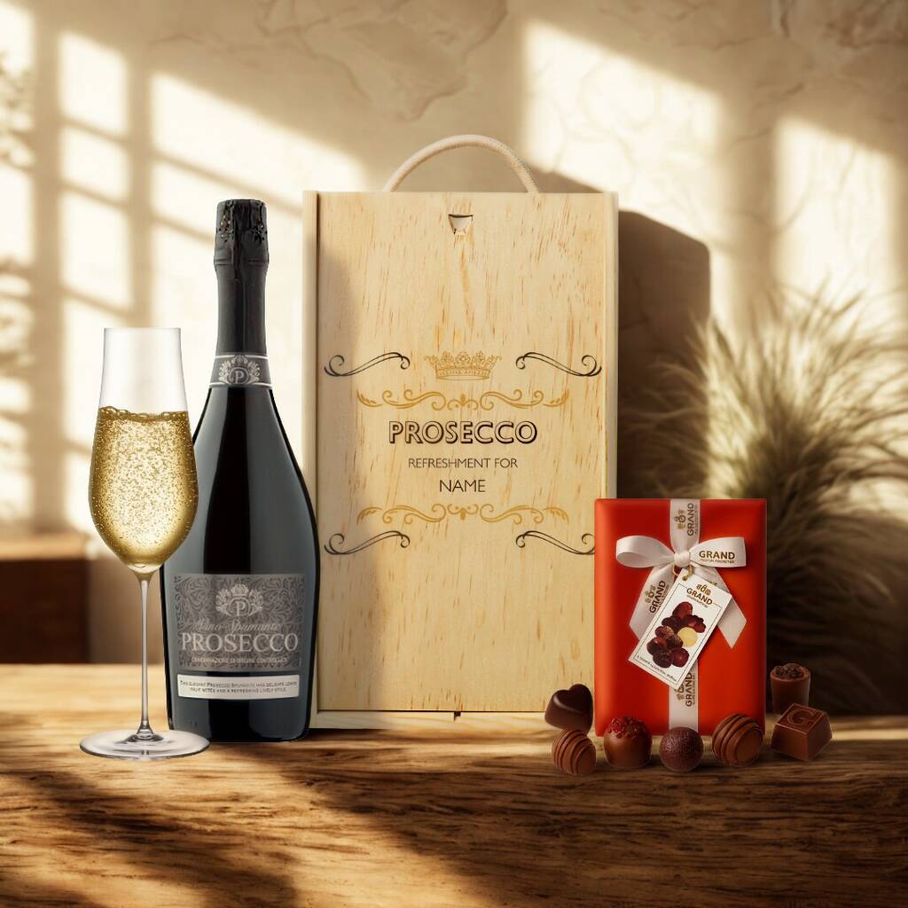 Personalised Vino Spumante Prosecco Gift Box With Luxury Belgian Chocolates 75cl