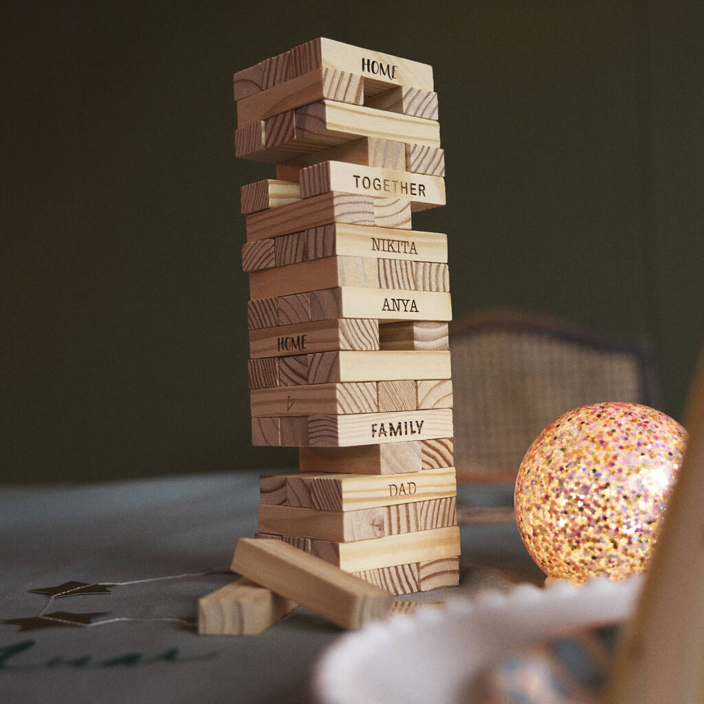 Stack them up and watch them fall. A traditional wooden game with a personalised vibe, made just for you and your family.