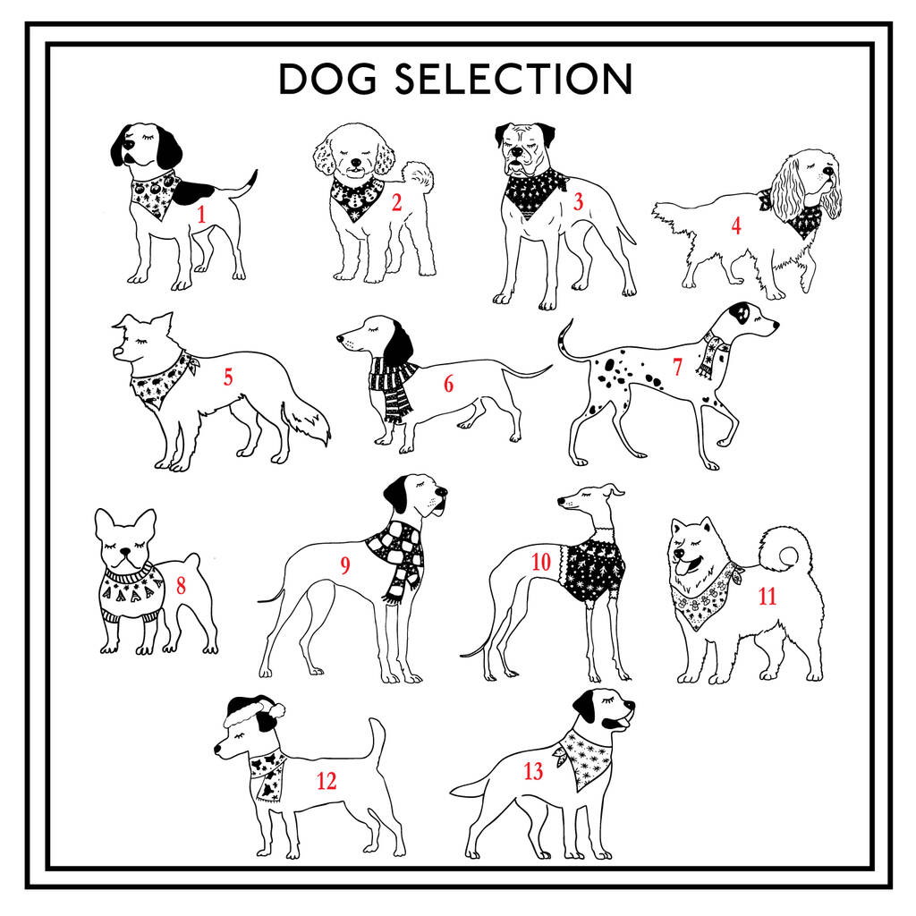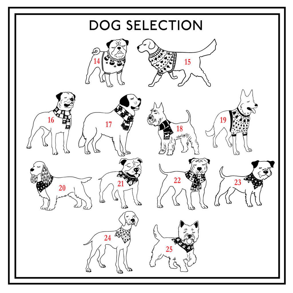 Each dog in this brilliant collection has a little festive outfit. Maybe a scarf, a bandana, or a jumper. Look closely and you'll see the details on the outfit are specific to each breed. The greyhound and whippets jumper has a rabbit on it. The retriever has a duck. the Collie's bandana has sheep of course, and the German Shepherd - well that big old softie has teddies on his jumper.