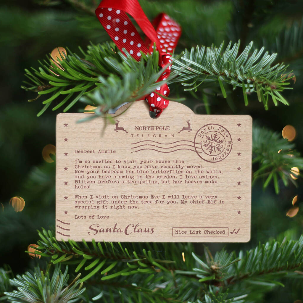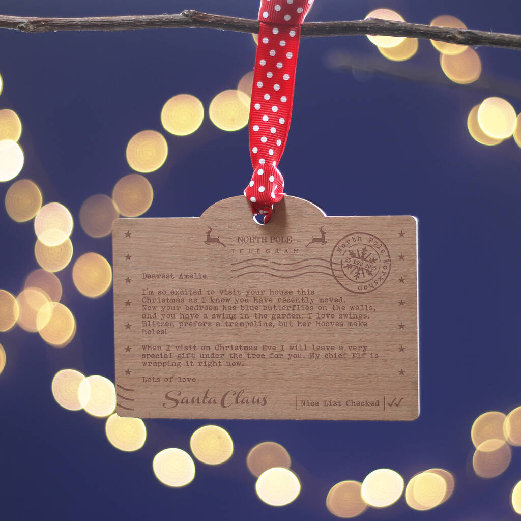 A bespoke telegram from Santa Claus, engraved on a wooden Christmas tree decoration. A wonderful heirloom ornament for your child.