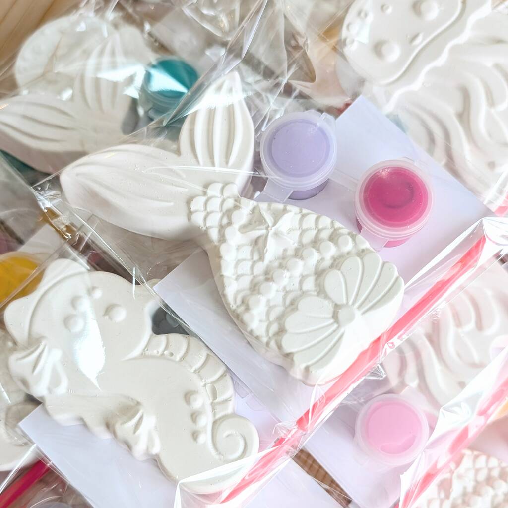 Each kit is individually wrapped in a cellophane bag. The kit contains 2 paint colours (chosen at random), 1 paint brush and a memaid/ocean themed shape (chosen at random).