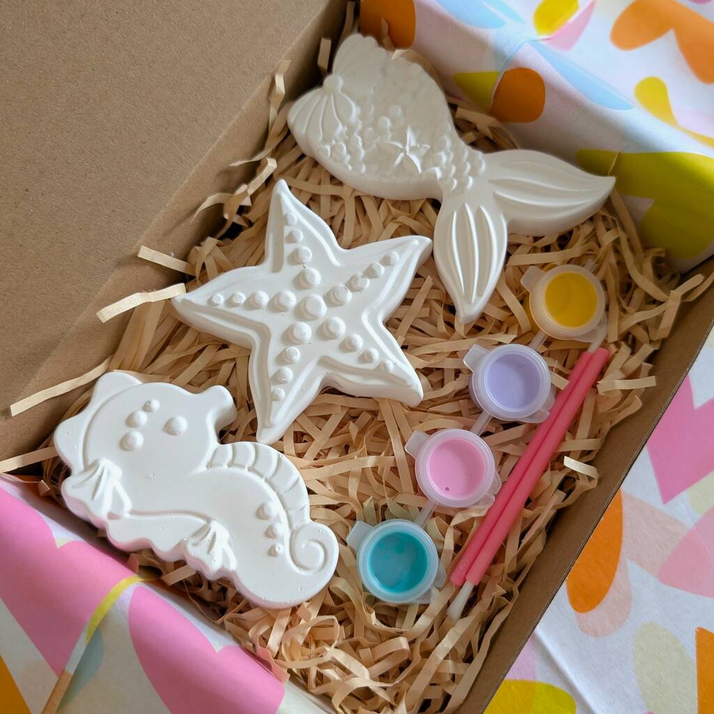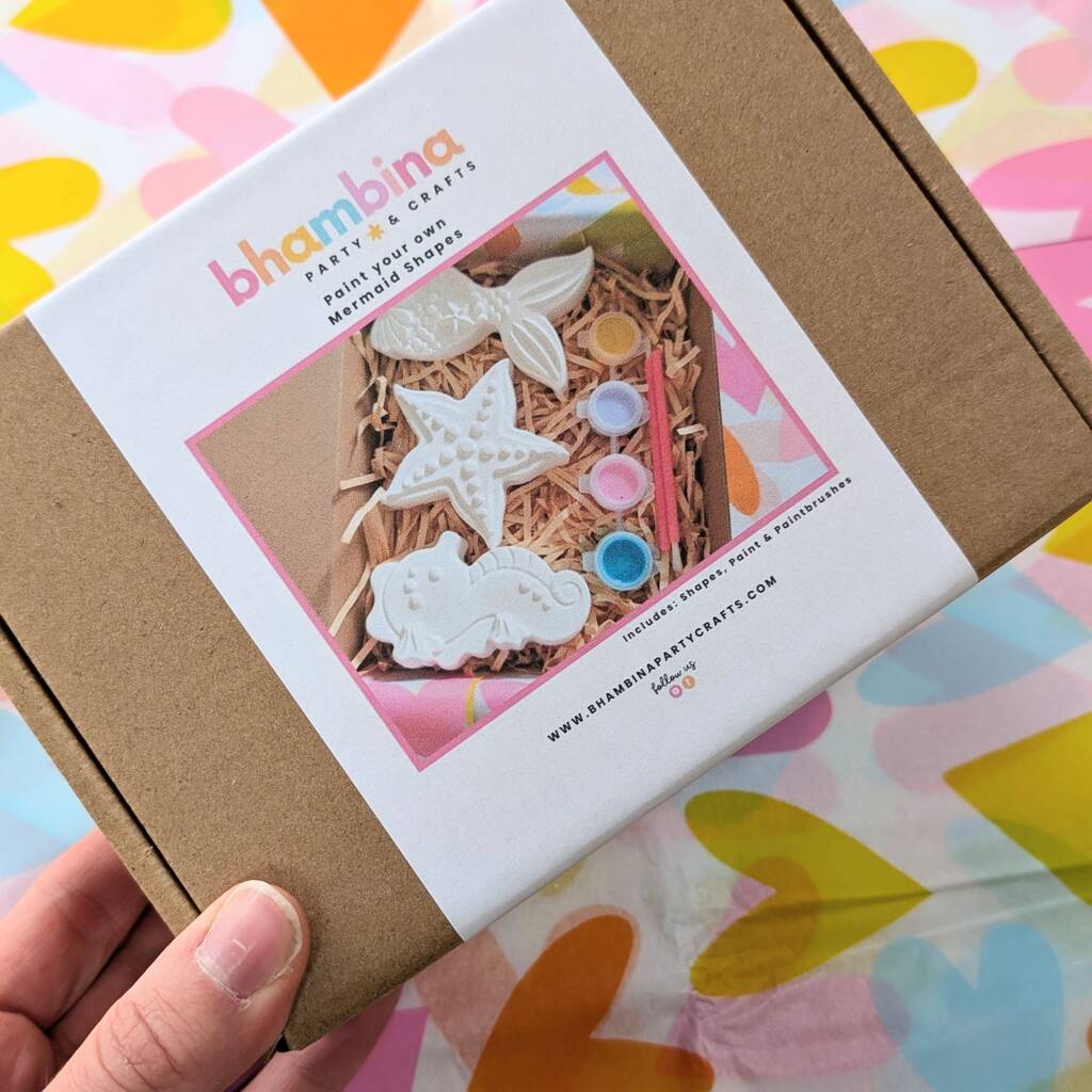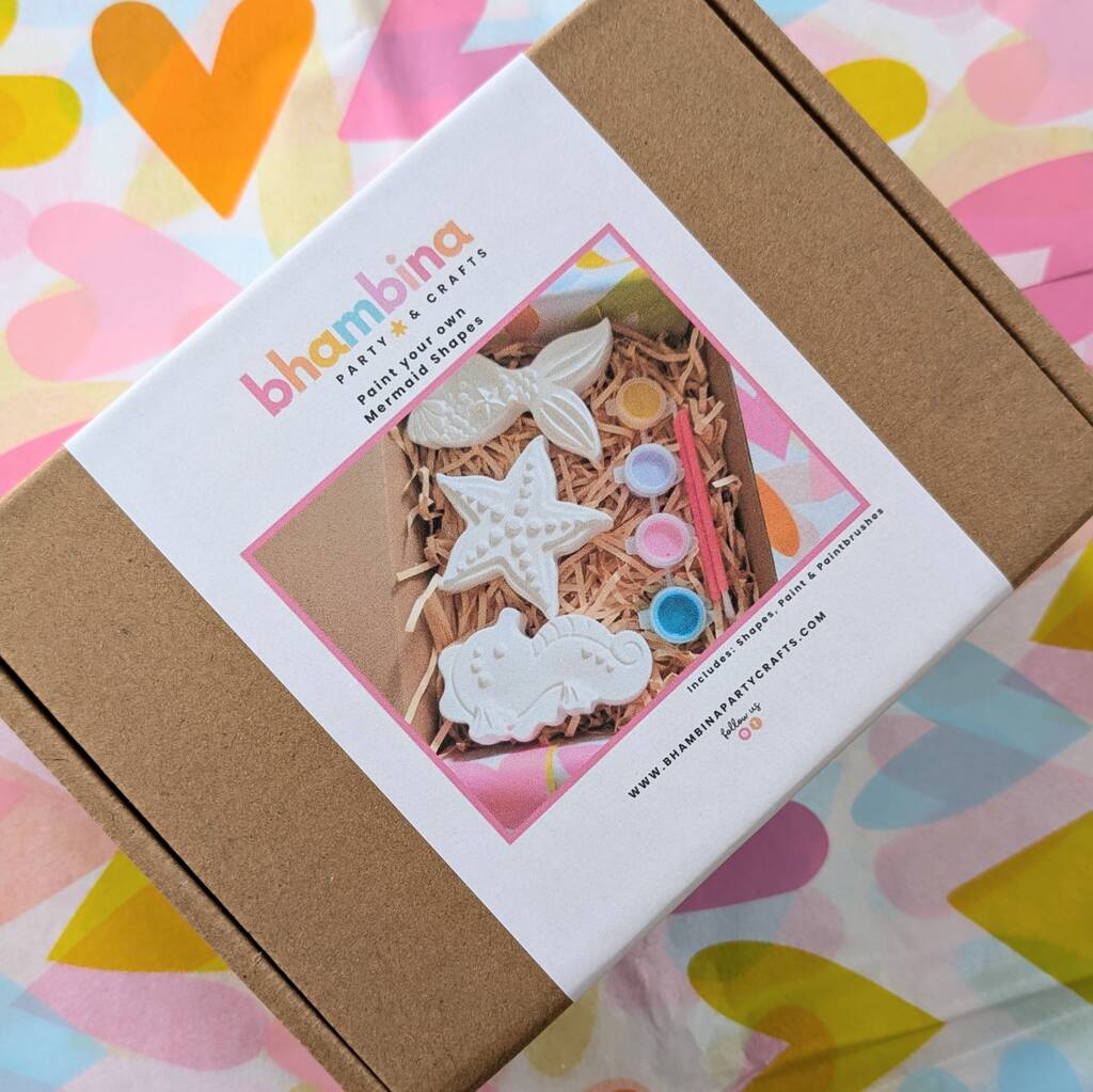 Unleash creativity and spark joy with our Paint your own mermaid shapes kids’ craft gift box!