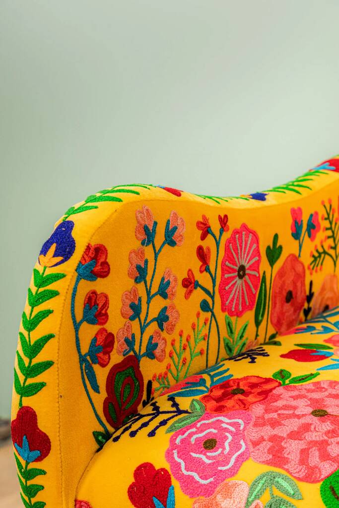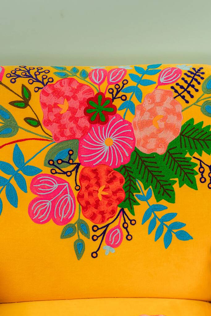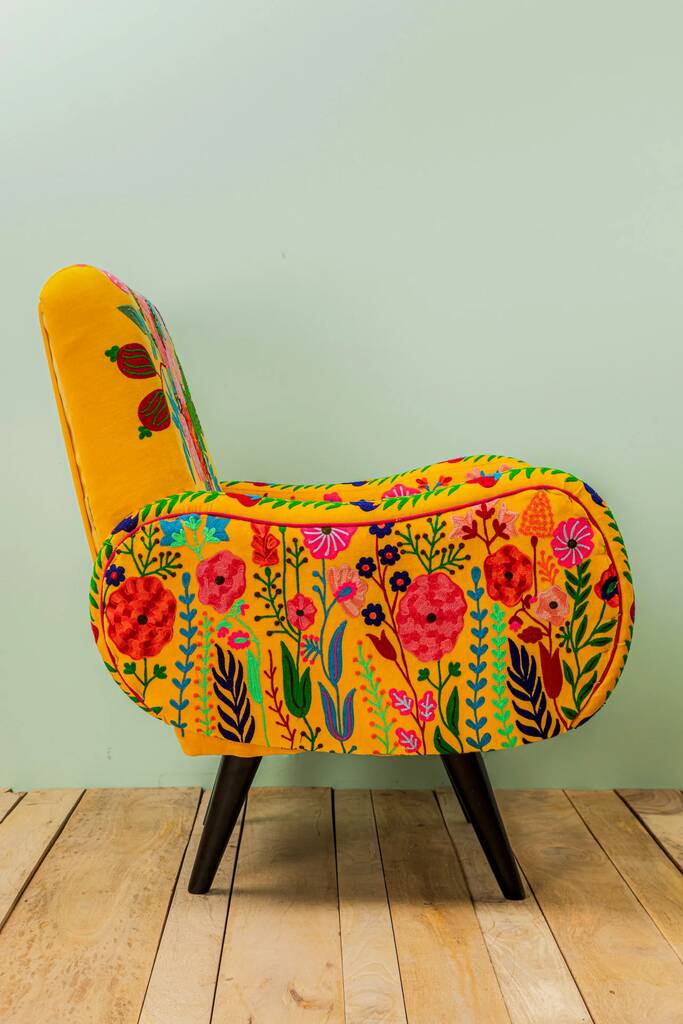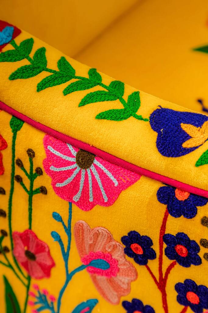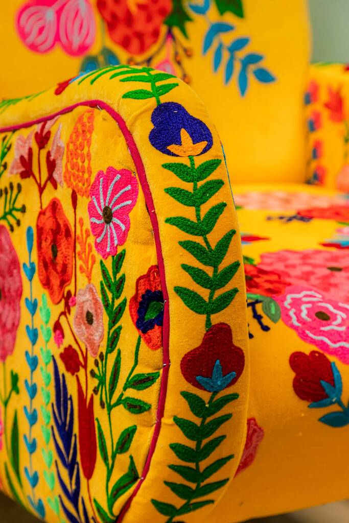 Yellow Floral Embroidered Velvet Wooden Armchair