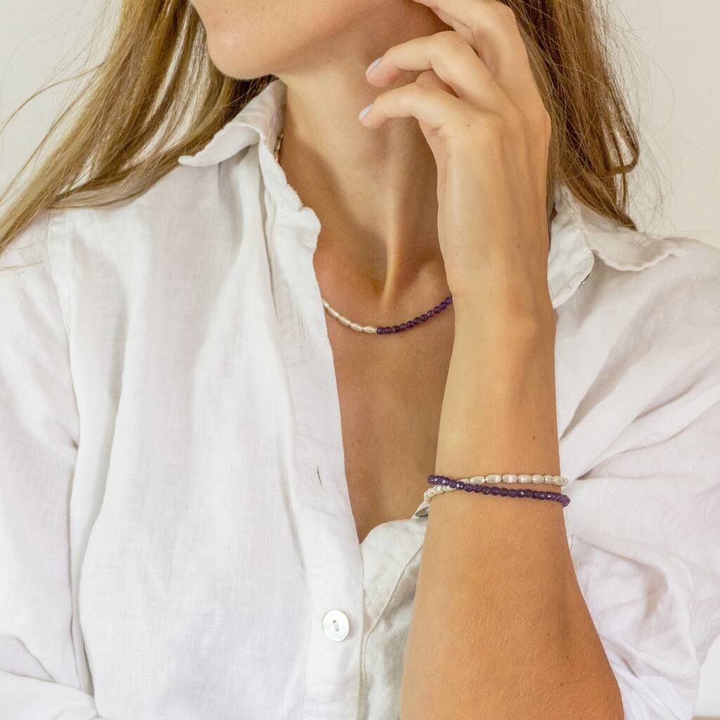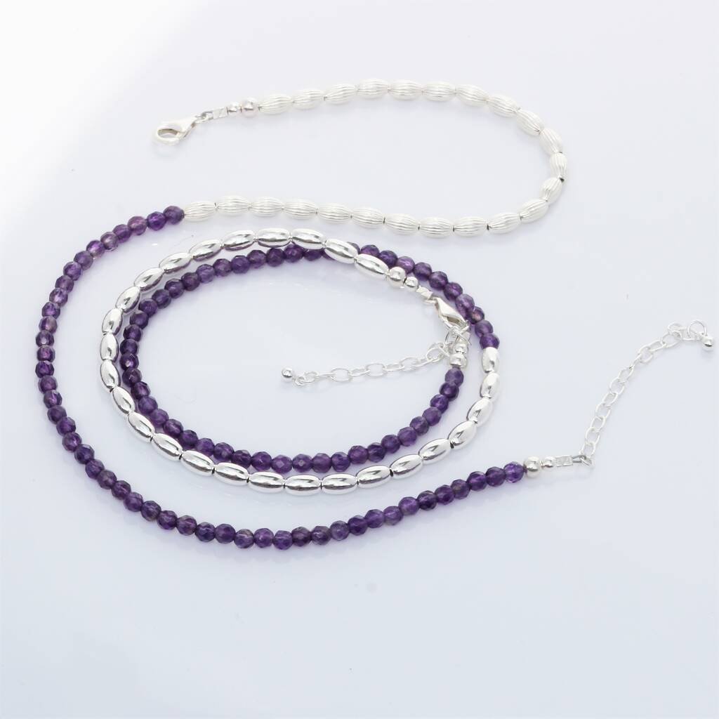 Amethyst gemstone and silver jewellery to be worn as a necklace or double stranded bracelet. Transformable jewellery is the perfect gift for amethyst loving women