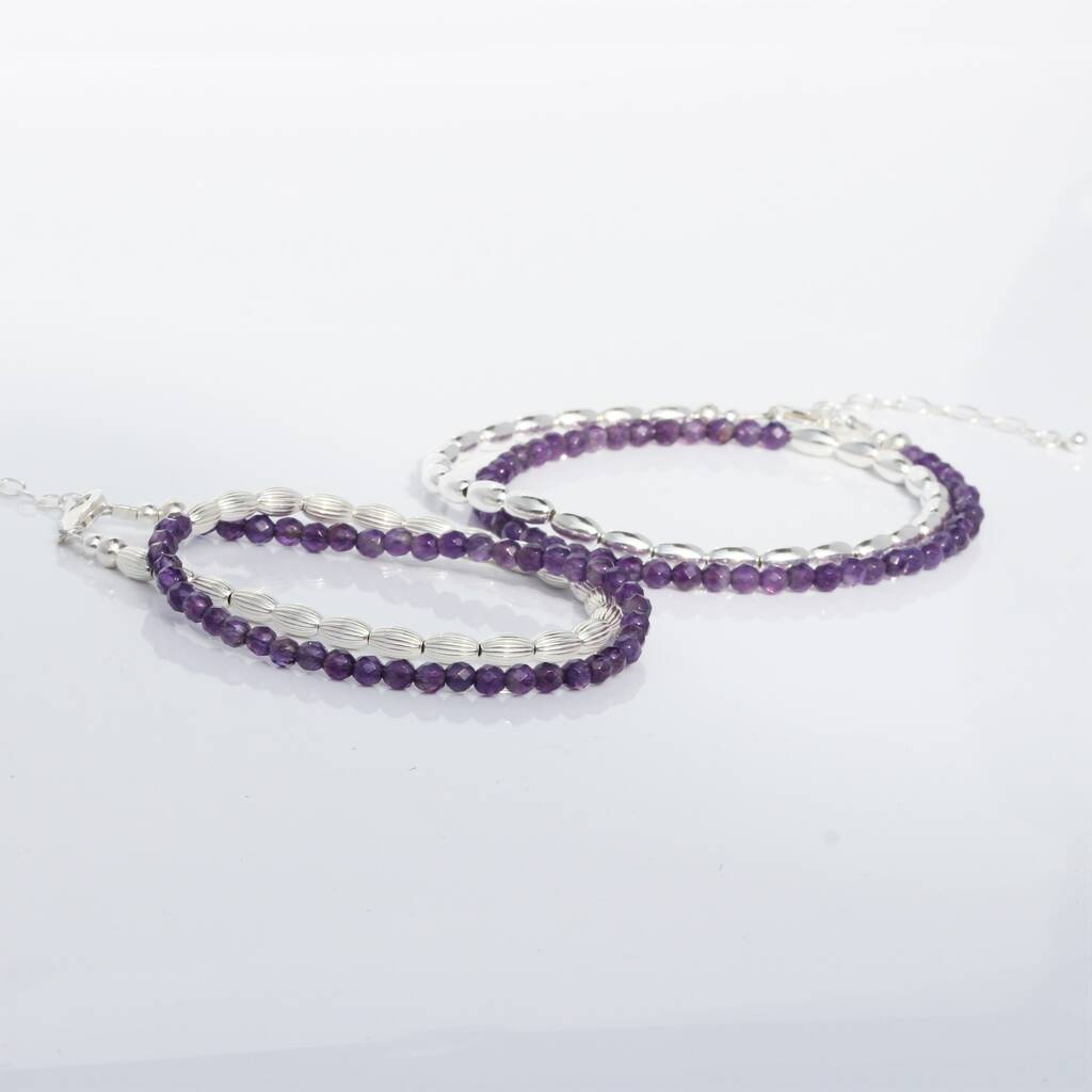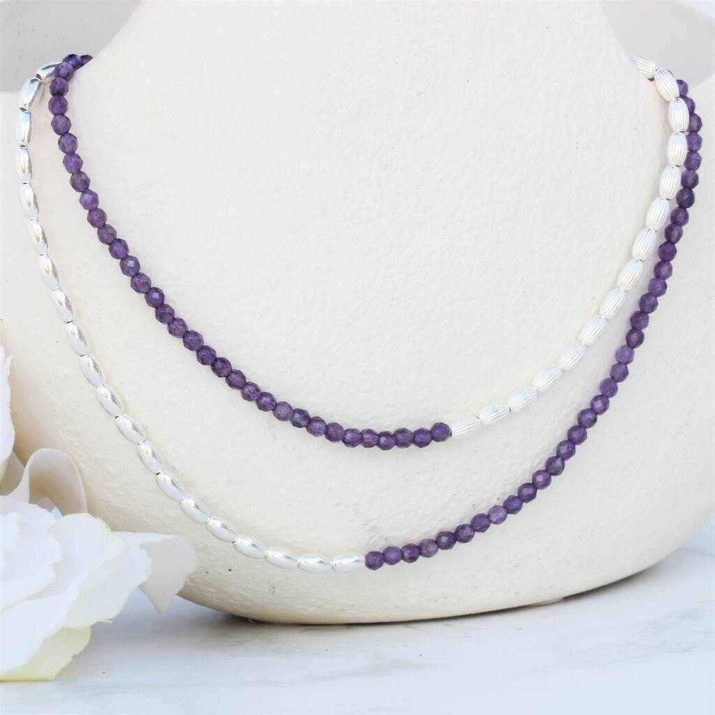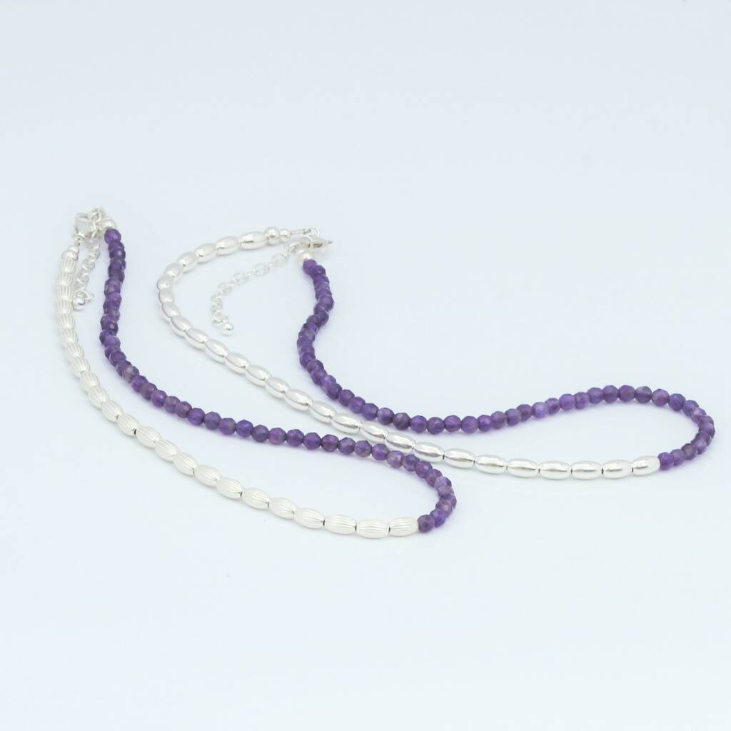 Choose from plain or ribbed sterling silver beads, which beautifully compliment the deep purple of the amethyst.