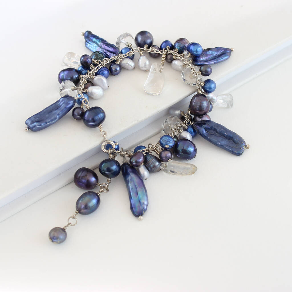 These freshwater pearl bracelets are contemporary and unusual freshwater pearls cascade along a sterling silver link chain, with crystal chips and and faceted crystal quartz for added sparkle, as they catch the light. The pearls of different shapes and sizes are handwired onto the bracelet using sterling silver.