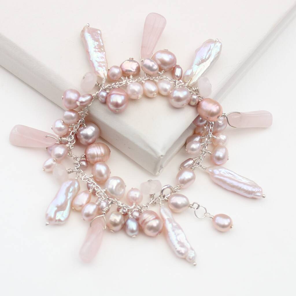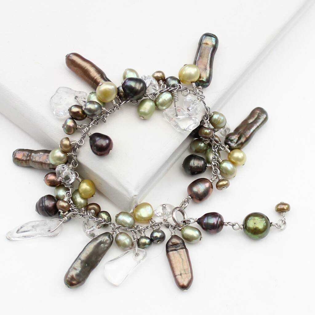 Gorgeous unusual modern pearl bracelet for women comprising of various shapes and sizes of freshwater pearls with faceted crystal quartz to make it sparkle.
