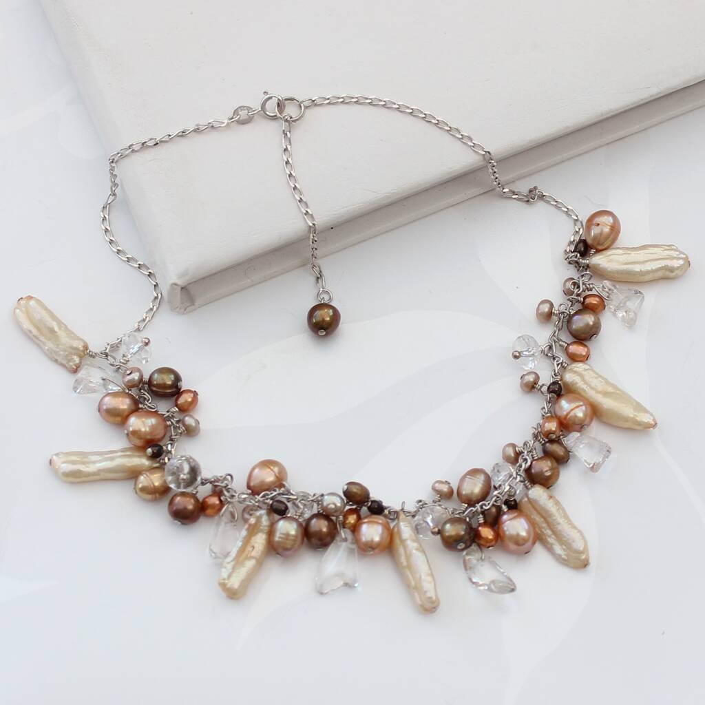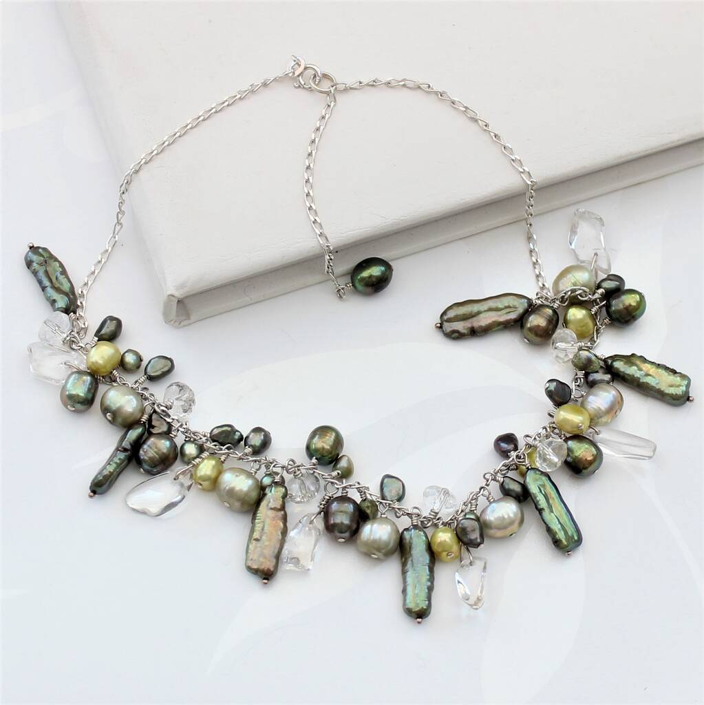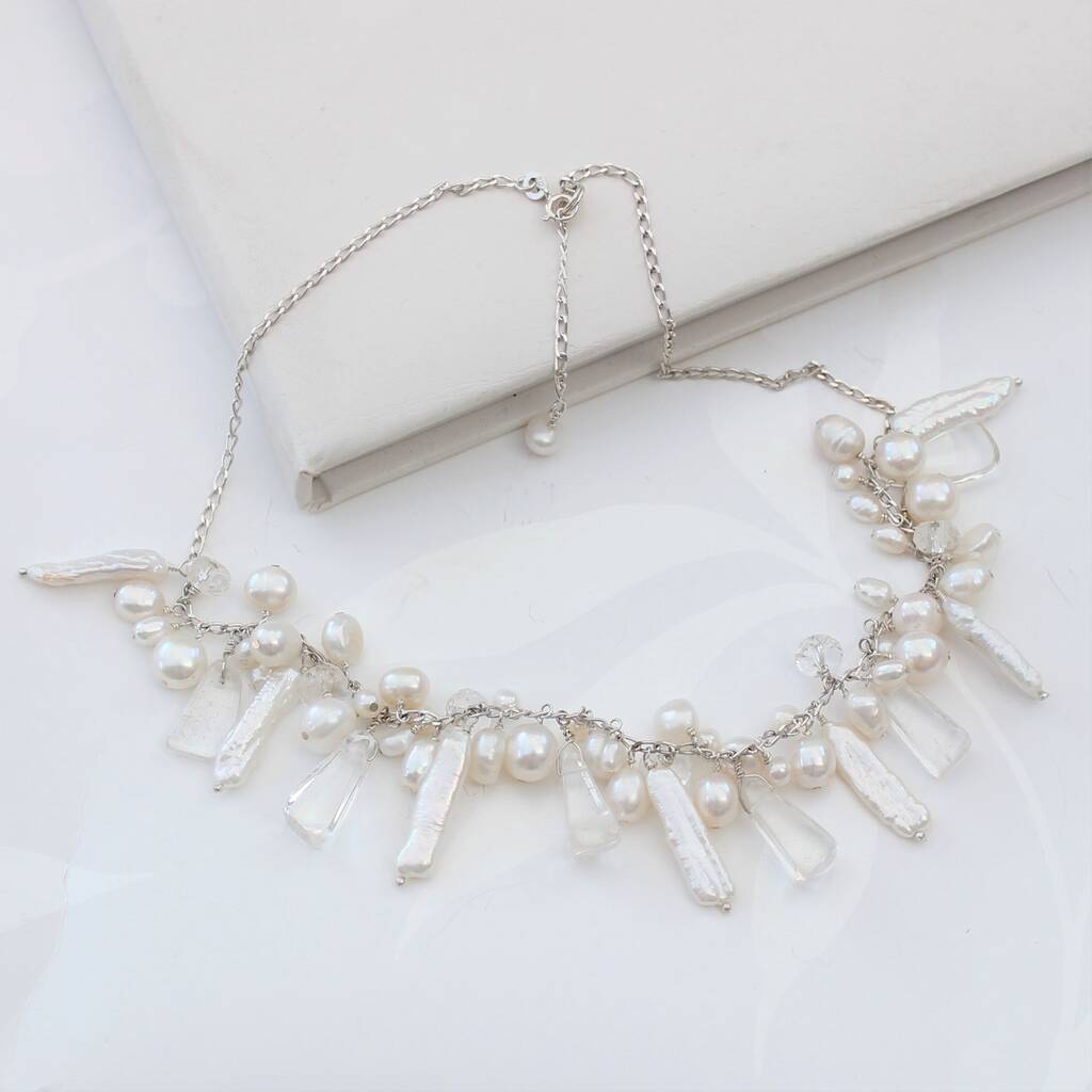 These necklaces are contemporary and unusual freshwater pearls cascade along a sterling silver link chain, with crystal chips and and faceted crystal quartz for added sparkle, as they catch the light. The pearls of different shapes and sizes are handwired onto the necklace using sterling silver.