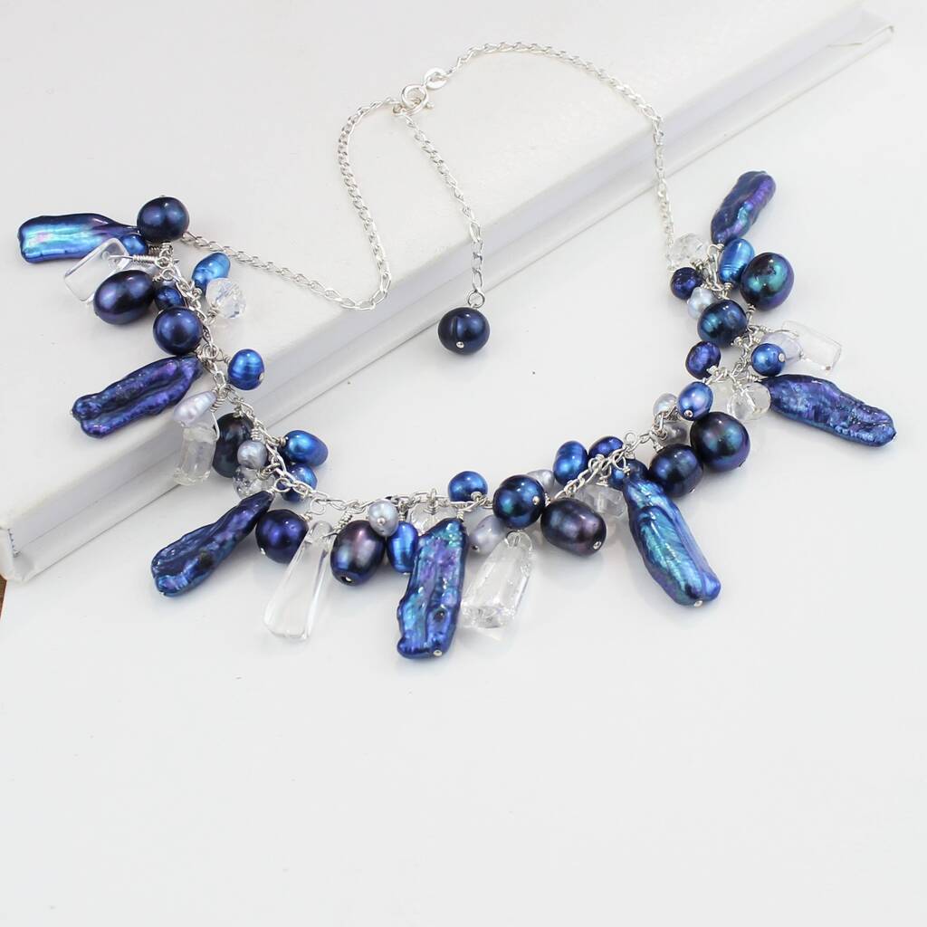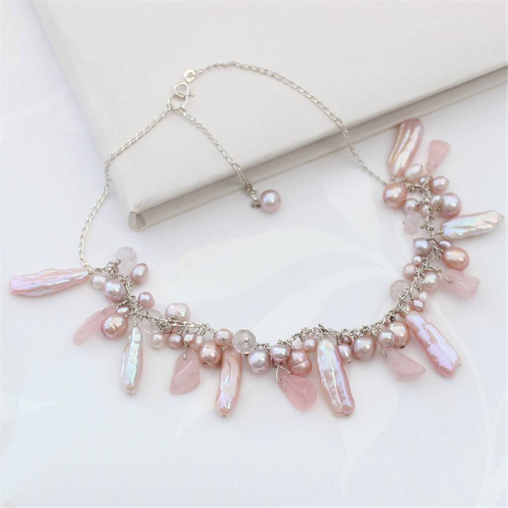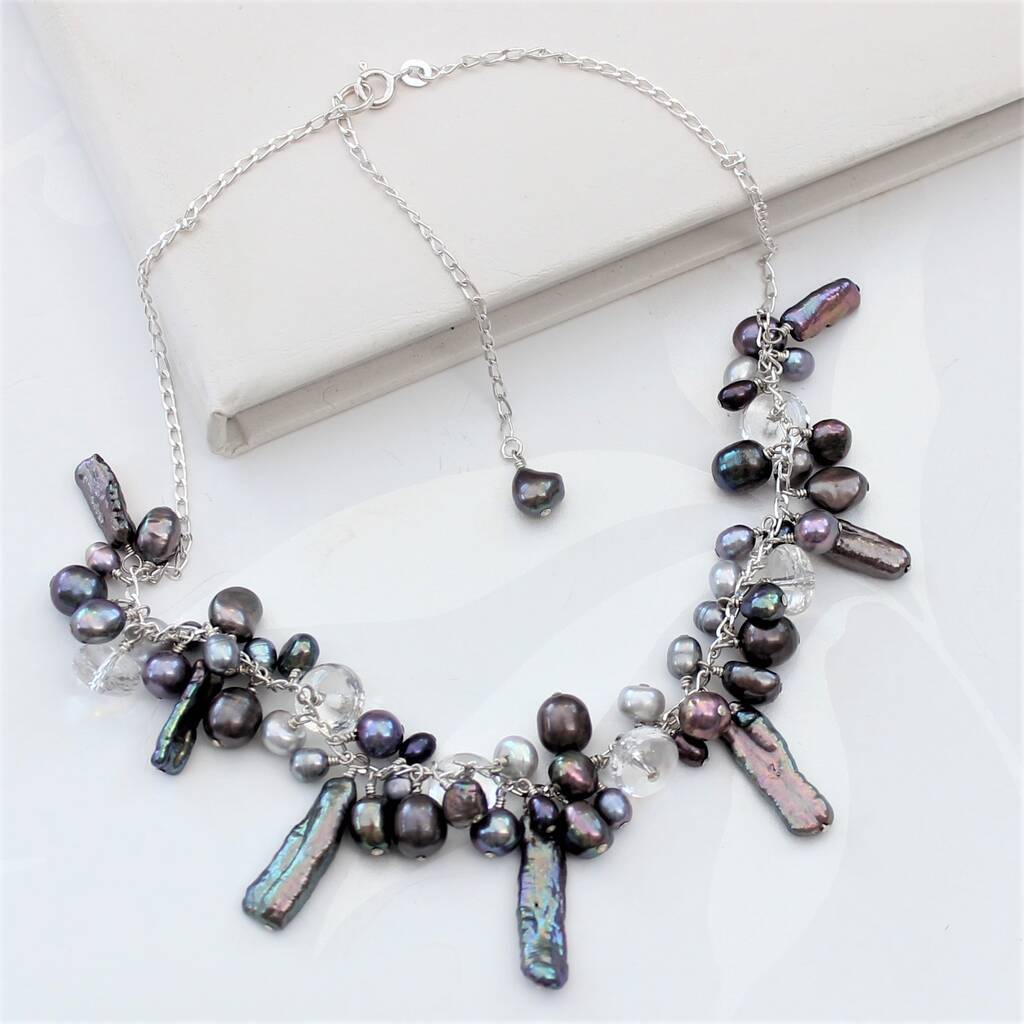 These necklaces are contemporary and unusual freshwater pearls cascade along a sterling silver link chain, with crystal chips and and faceted crystal quartz for added sparkle, as they catch the light. The pearls of different shapes and sizes are handwired onto the necklace using sterling silver.