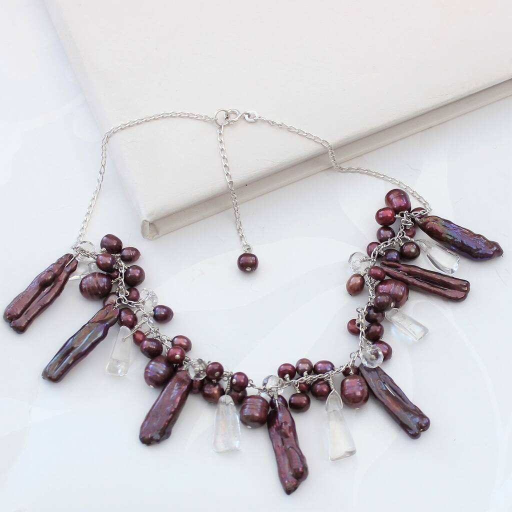 Gorgeous unusual modern pearl necklace for women comprising of various shapes and sizes of freshwater pearls with faceted crystal quartz to make it sparkle.