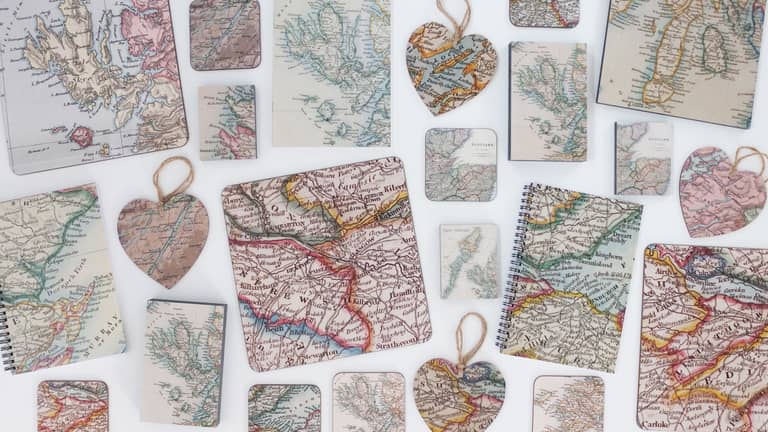Using very old and vintage ancient maps, Kirsty uses these images to create beautiful and unusual homeware. As the maps use traditional muted colours, the lamp shades, cushions and platter boards, cups, coasters and decorations all match well with modern and traditional homes.