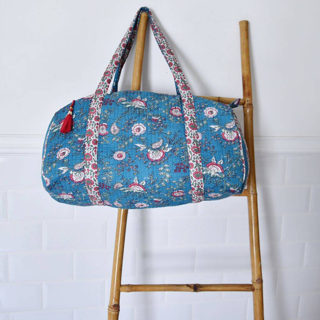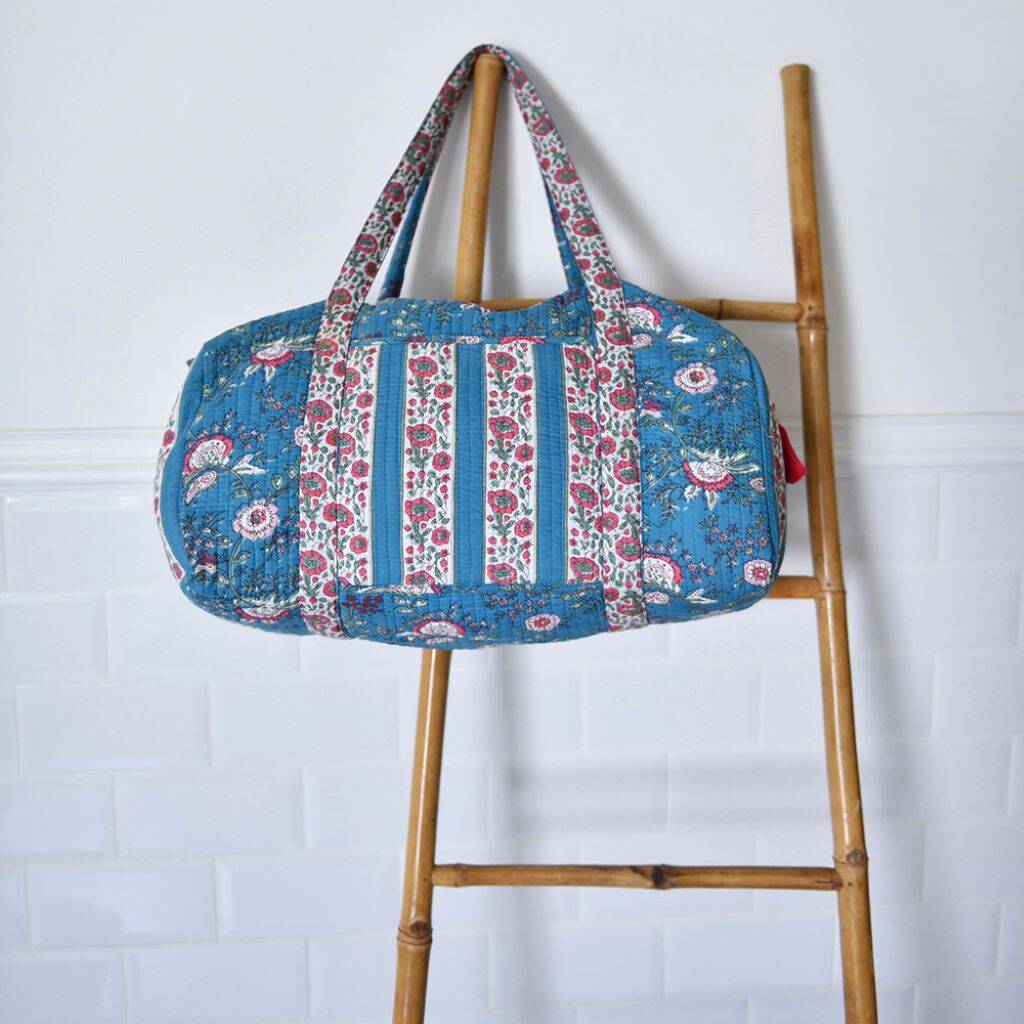 Block Printed Inky Blue And Pink Floral Stripe Quilted Duffle Bag