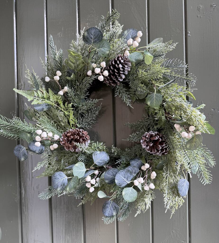 Elevate your winter décor with this stunning Winter White Wreath. Measuring approximately 65cm, it features lush faux ferns, pine branches, pinecones, and crisp white winter berries for a stylish, seasonal touch. This wreath effortlessly brings a cosy, festive feel to any space, making it the perfect statement piece for your winter styling.