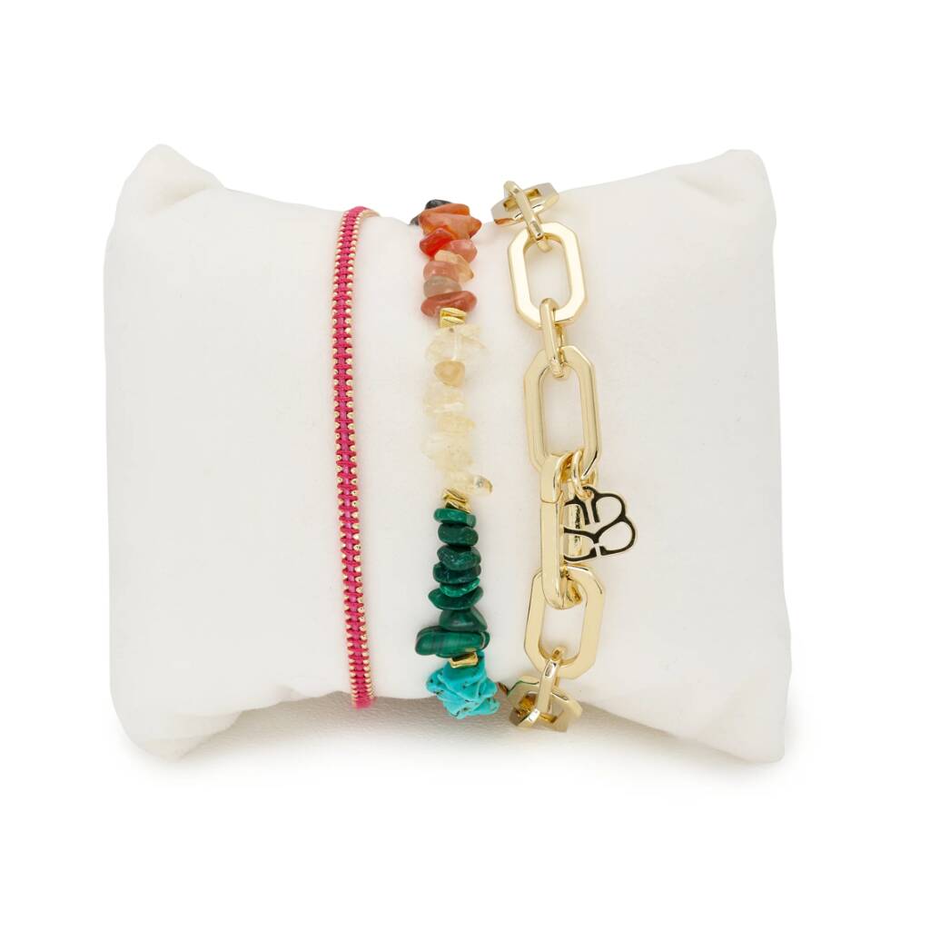 Hue - Elevate your style with the Hue 3-layered gemstone bracelet stack. Add a pop of colour and wellness to your look this season with Braid, Kenzo, and Crisos bracelets. This vibrant and stylish gemstone ensemble effortlessly complements your outfit, providing a perfect blend of trendiness and positive energy. Make a statement with this meticulously curated bracelet stack a must-have for a chic and colourful season.