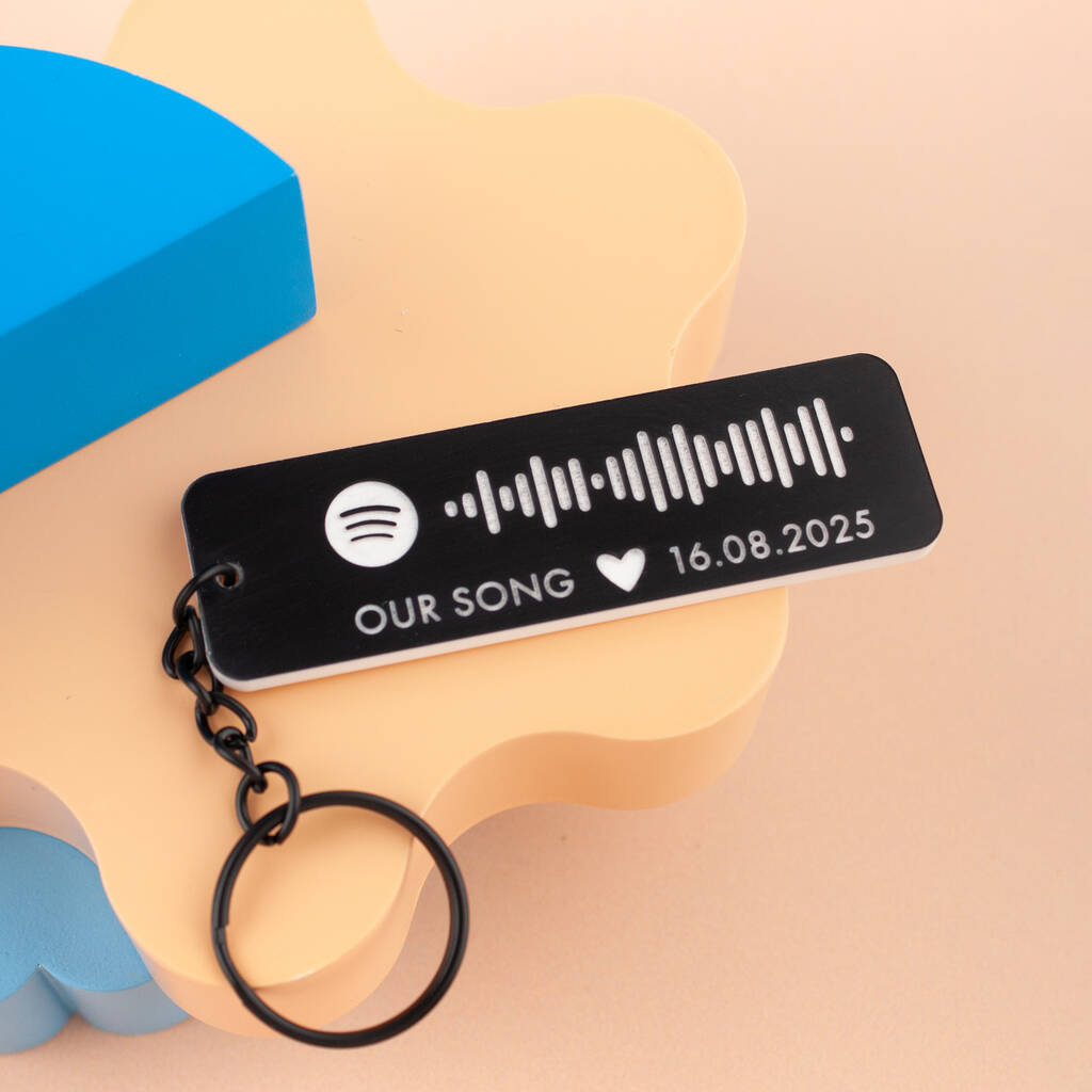 Choose any Spotify Song, Album, Playlist or Radio, and we'll find the unique spotify code and laser engrave it on your keyring, along with "Our Song", a heart and your chosen date..