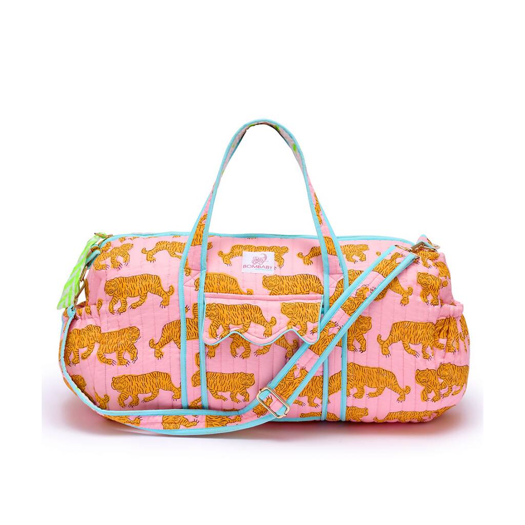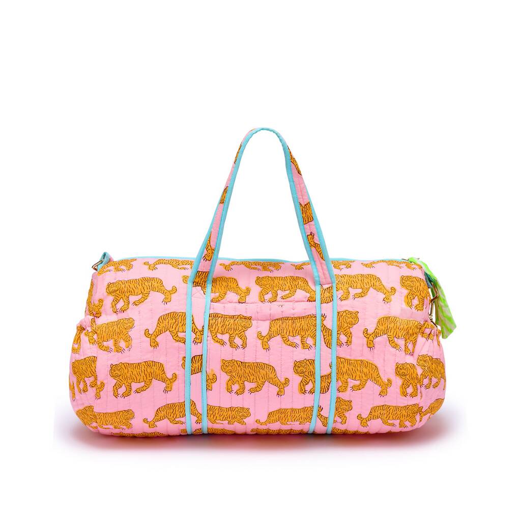 Unleash your inner wild with the Powder Pink Tiger Weekend Bag, a piece that blends bold charm with bohemian flair.