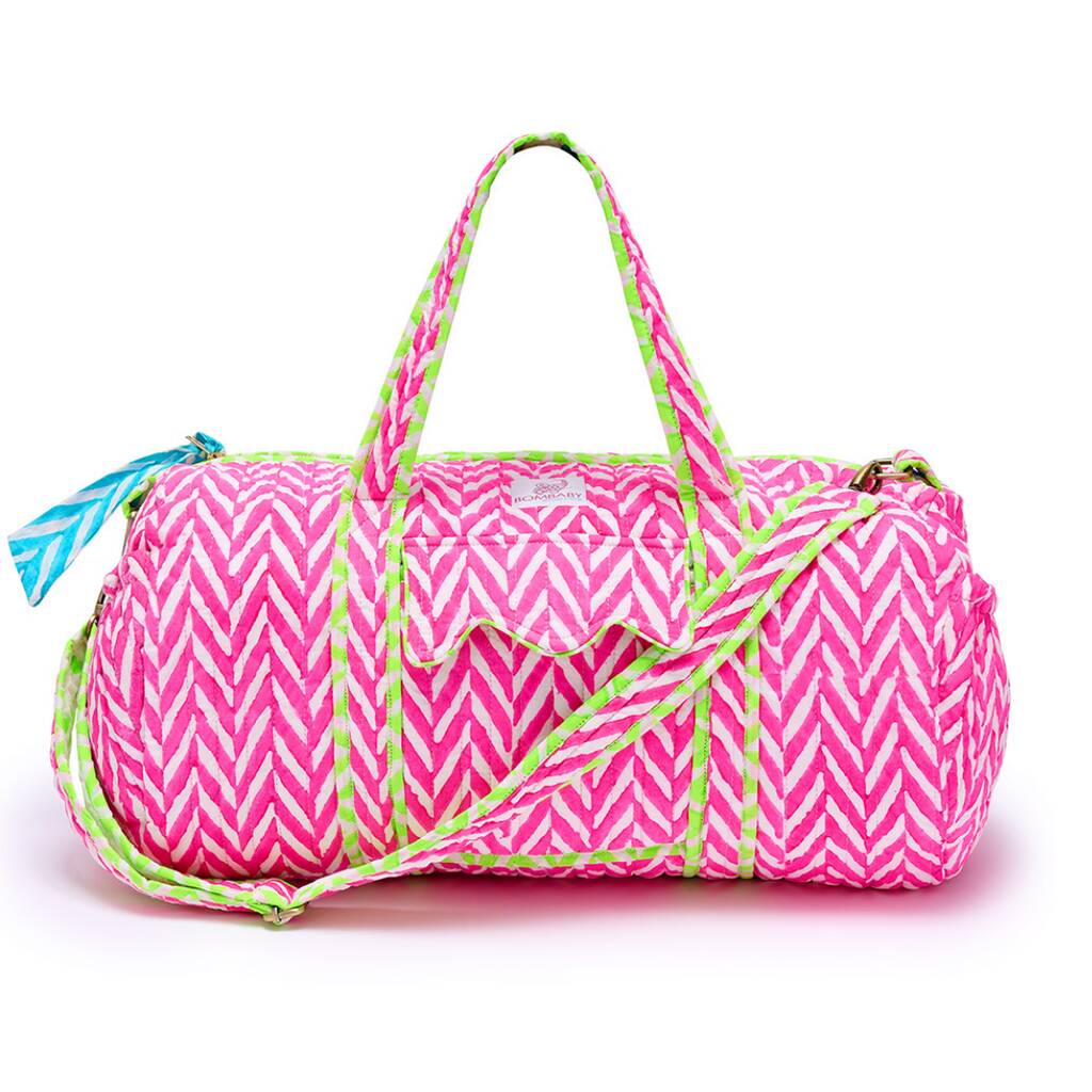 A generously quilted and spacious block print weekend bag in a bespoke neon design.